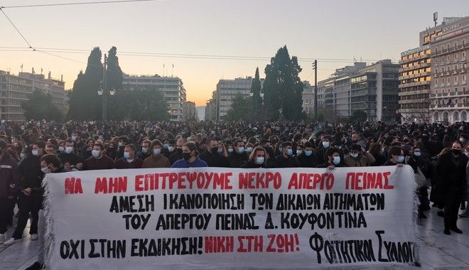 Για τέταρτη συνεχή βραδιά πραγματοποιήθηκε στην Αθήνα μαζική και δυναμική συγκέντρωση και πορεία για τη δικαίωση της απεργία πείνας του Δημήτρη Κουφοντίνα, παρά τα διχτατορικά μέτρα της χούντας Μητσοτάκη απαγόρευσης μετακινήσεων και αστυνομοκρατίας της πλατείας Συντάγματος και κλειστούς σταθμούς του μετρό και του Ηλεκτρικού.