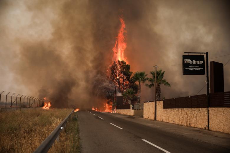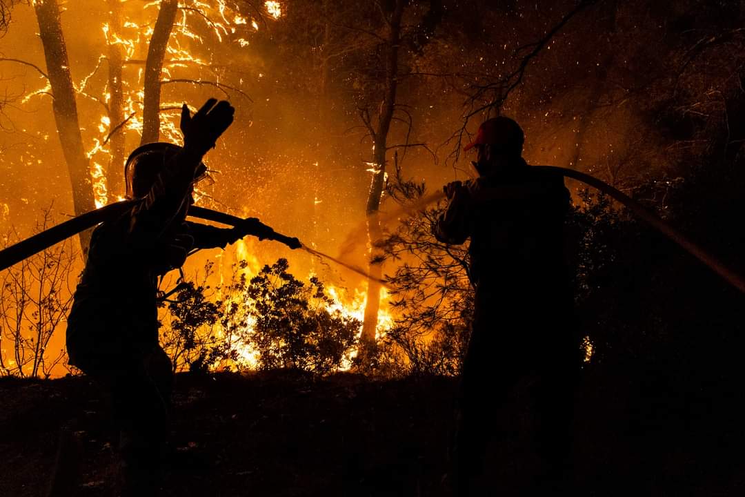 Πυροσβέστες μάχονται ενάντια στις πυρκαγιές στην Αττική. Πάνω από 1.000 πυροσβέστες ήρθαν στην Ελλάδα από Ευρωπαϊκά και Αραβικά κράτη. Πρέπει να πολεμήσουν με τις ομάδες που συγκροτούν οι κάτοικοι. Φωτό Μάριος Λώλος