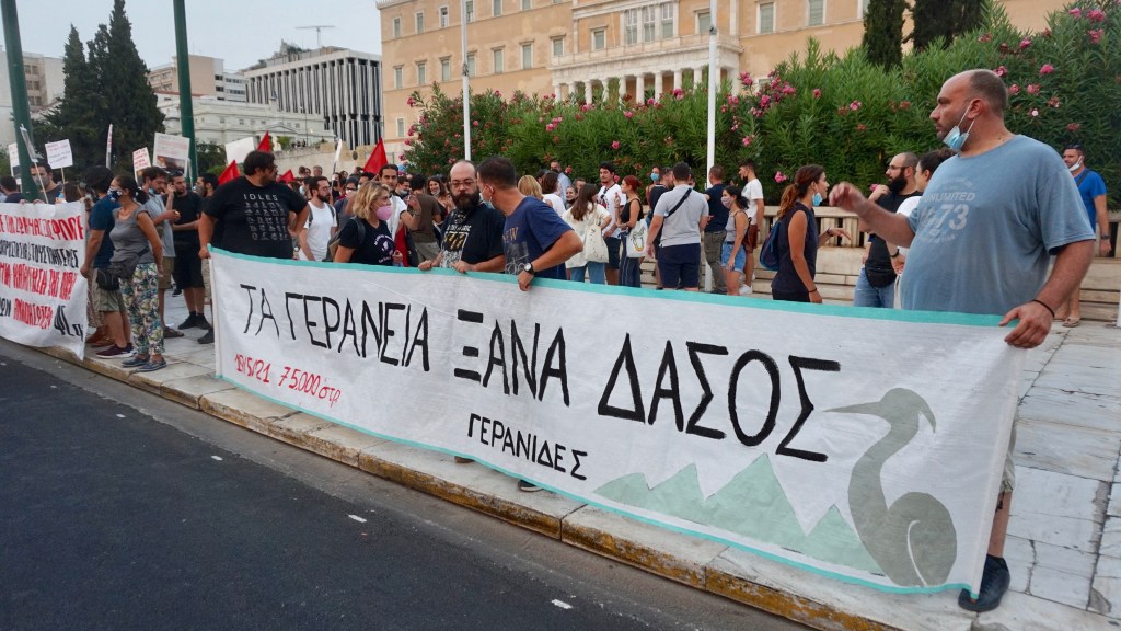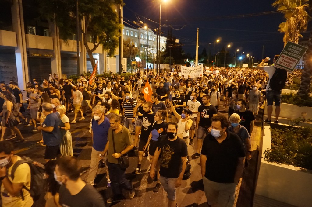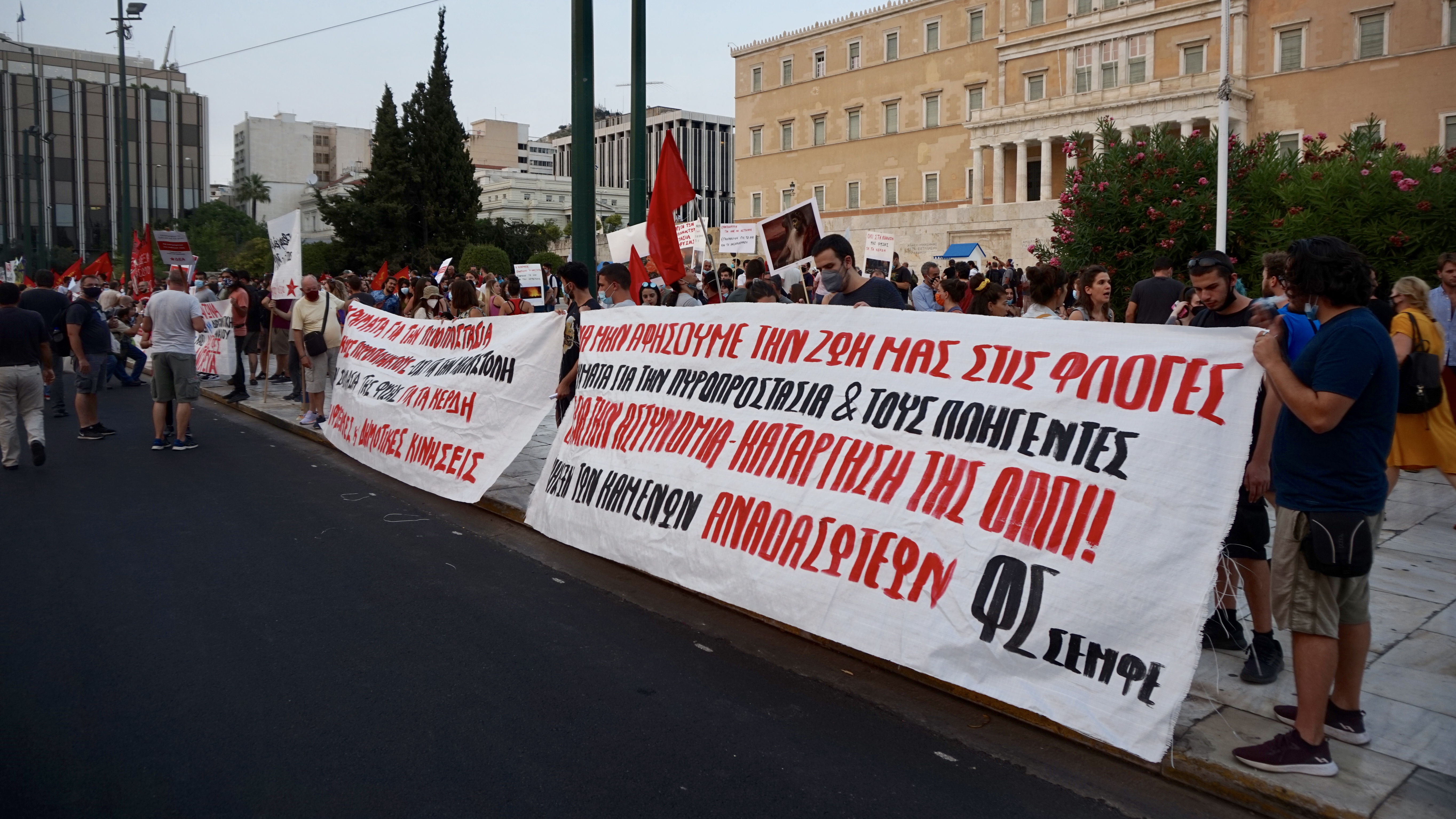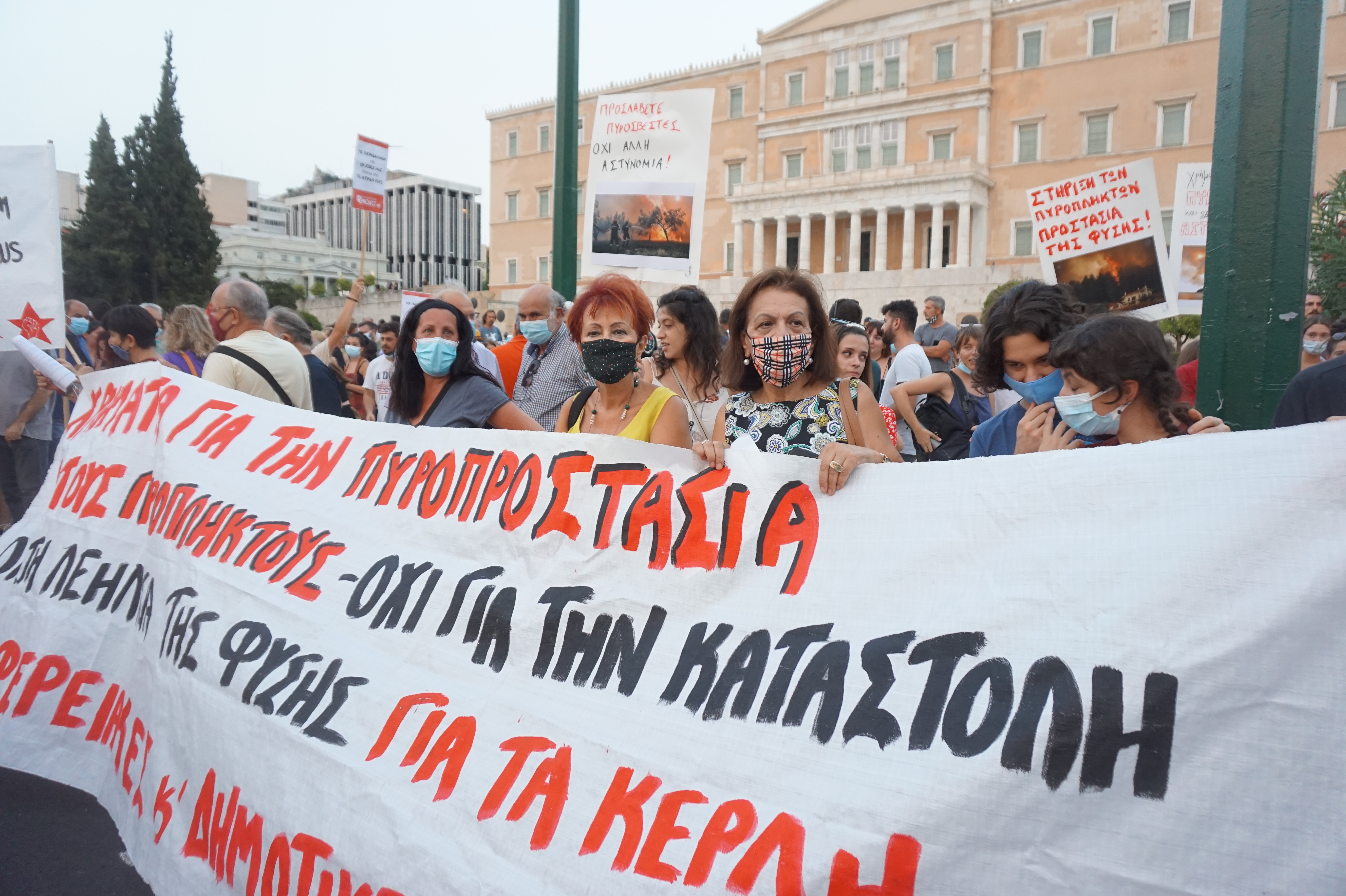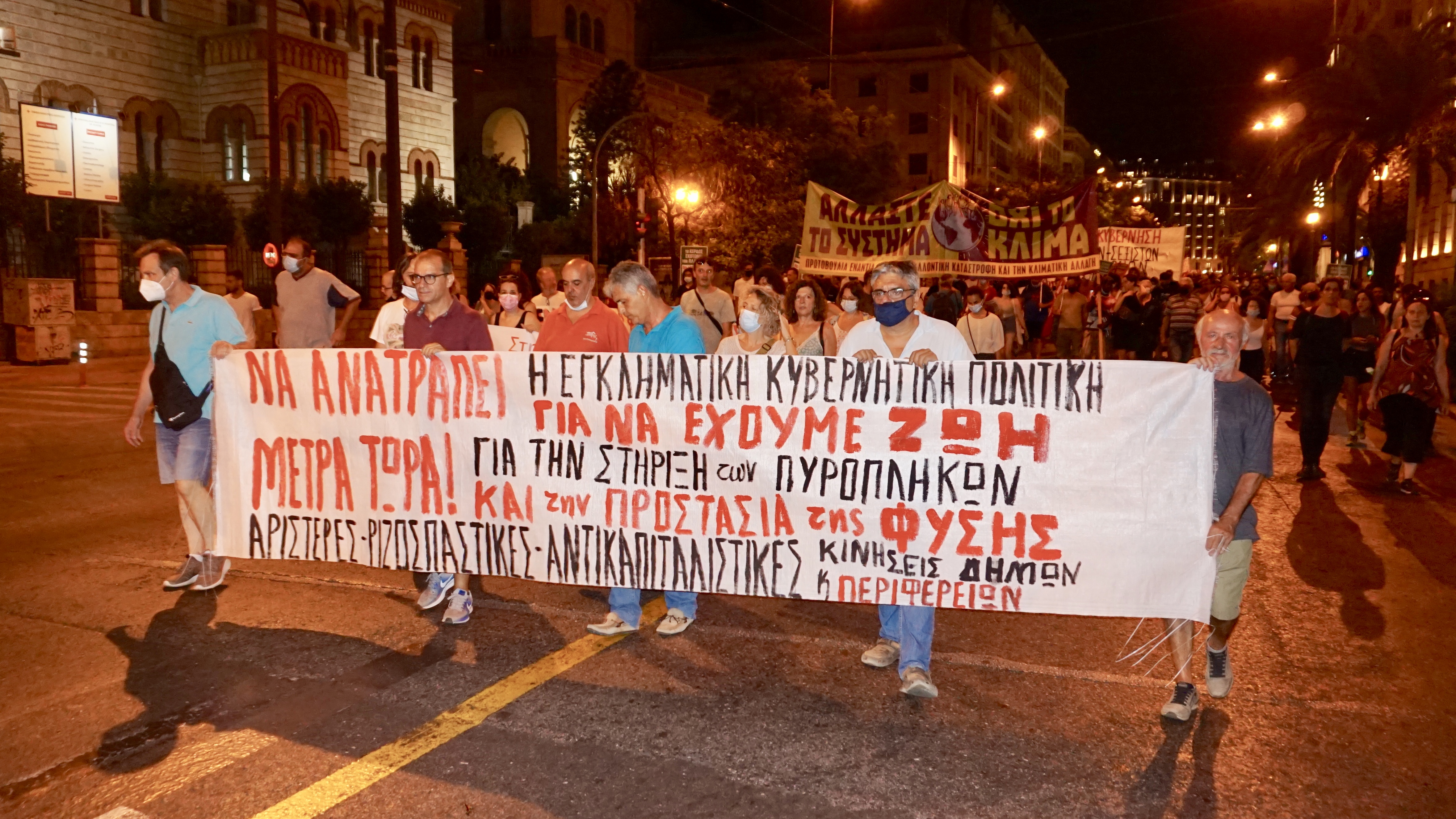 Το πανό στην κορυφή της χτεσινής πορείας. Στην πορεία συμμετείχαν κόμματα και οργανώσεις της Αριστεράς (ΑΝΤΑΡΣΥΑ, ΝΑΡ, ΣΕΚ, ΚΚΕ ΜΛ, μλ ΚΚΕ, ΟΚΔΕ, ΕΕΚ, κ.α.) καθώς και αναρχοσυνδικαλιστικές συλλογικότητες (ΡΟΣΙΝΑΝΤΕ κ.α.). Στη συγκέντρωση έξω από τη Βουλή ο αντιπρόσωπος των οργανωτών Κώστας Τουλγερίδης διάβασε κείμενο που ζητούσε πάλη για την ανατροπή της κυβέρνησης Μητσοτάκη και καλούσε σε αυτοοργάνωση των κατοίκων στις περιοχές των πυρκαγιών. Φωτό Ε.Α.
