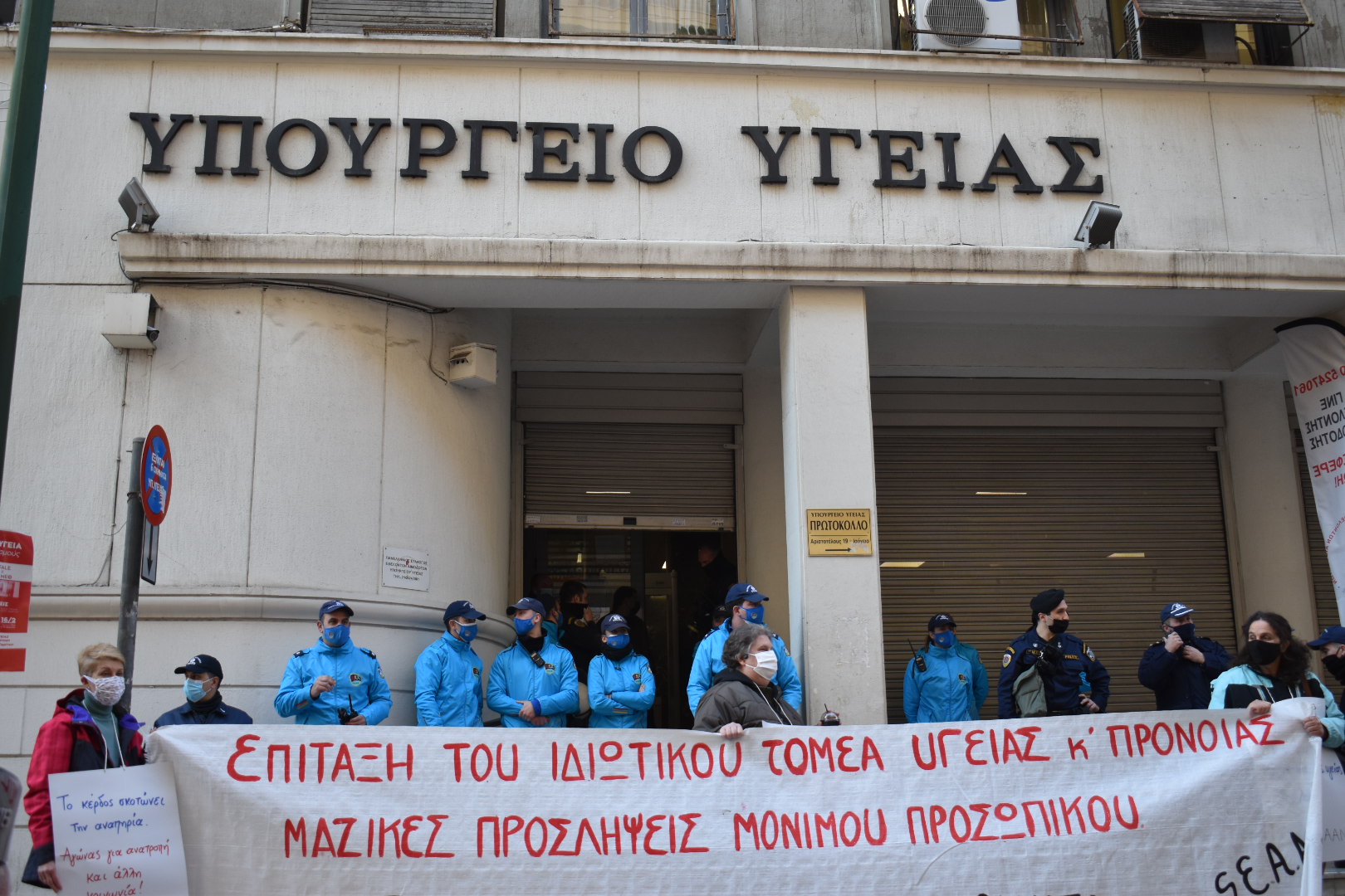 Απεργιακή κινητοποίηση στο Υπουργείο Υγείας στις 23/2/21. Οι διαδηλώσεις και στάσεις εργασίας δεν φτάνουν. Απαιτούνται καταλήψεις και πάλη για Γενική Πολιτική Απεργία Διαρκείας για την ανατροπή της χούντας Μητσοτάκη και τη συντριβή των Μνημονίων. Φωτό Κ. Μουρμούρης.