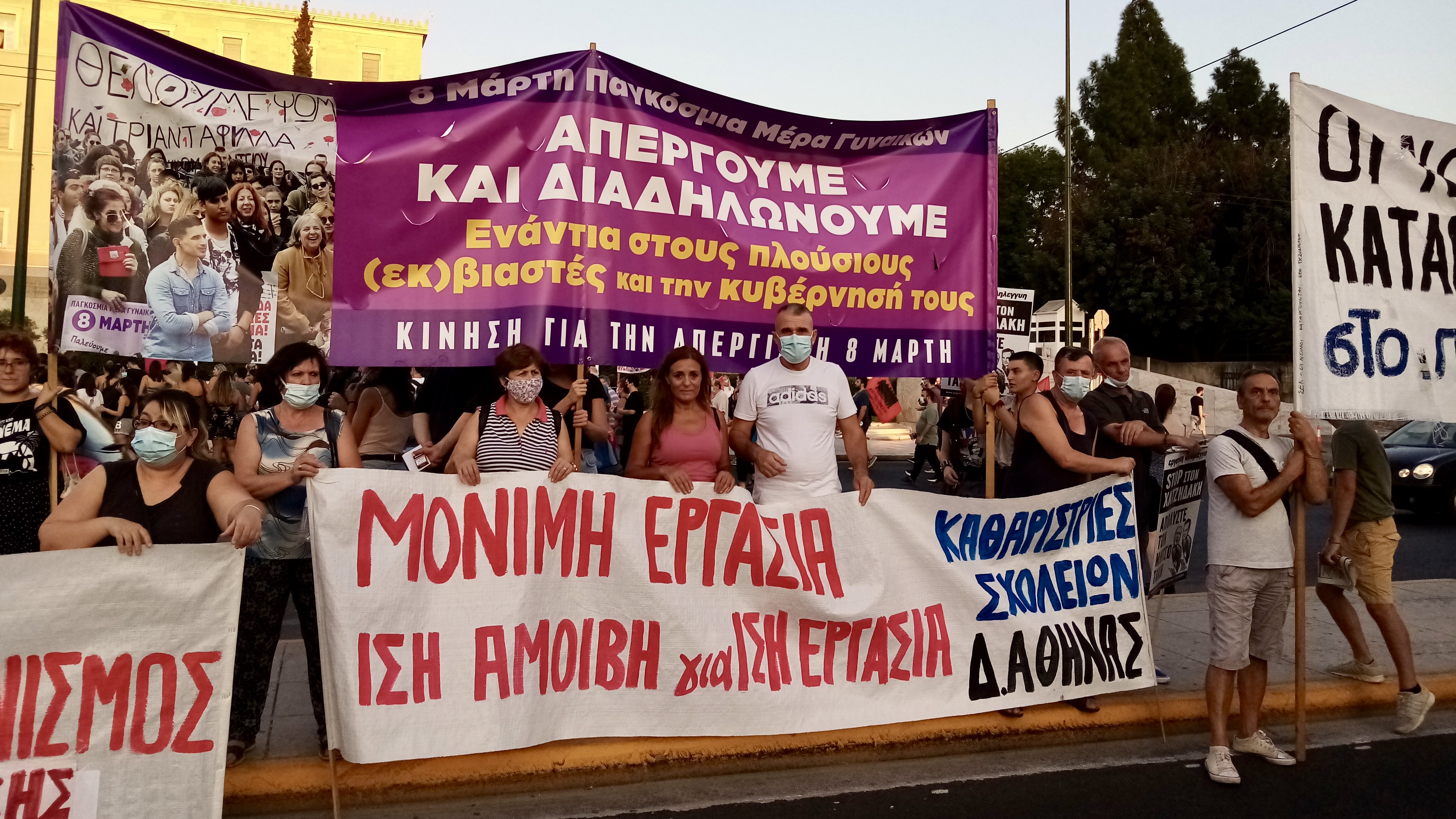 Το πανό των καθαριστριών σχολείων Αθήνας στη συγκέντρωση της ΑΔΕΔΥ και εργατικών σωματείων στο Σύνταγμα την Τετάρτη 1/9/. Στην άλλη άκρη του δρόμου μπροστά στη Βουλή πραγματοποιήθηκε η συγκέντρωση του ΚΚΕ. Φωτό Ε.Α.