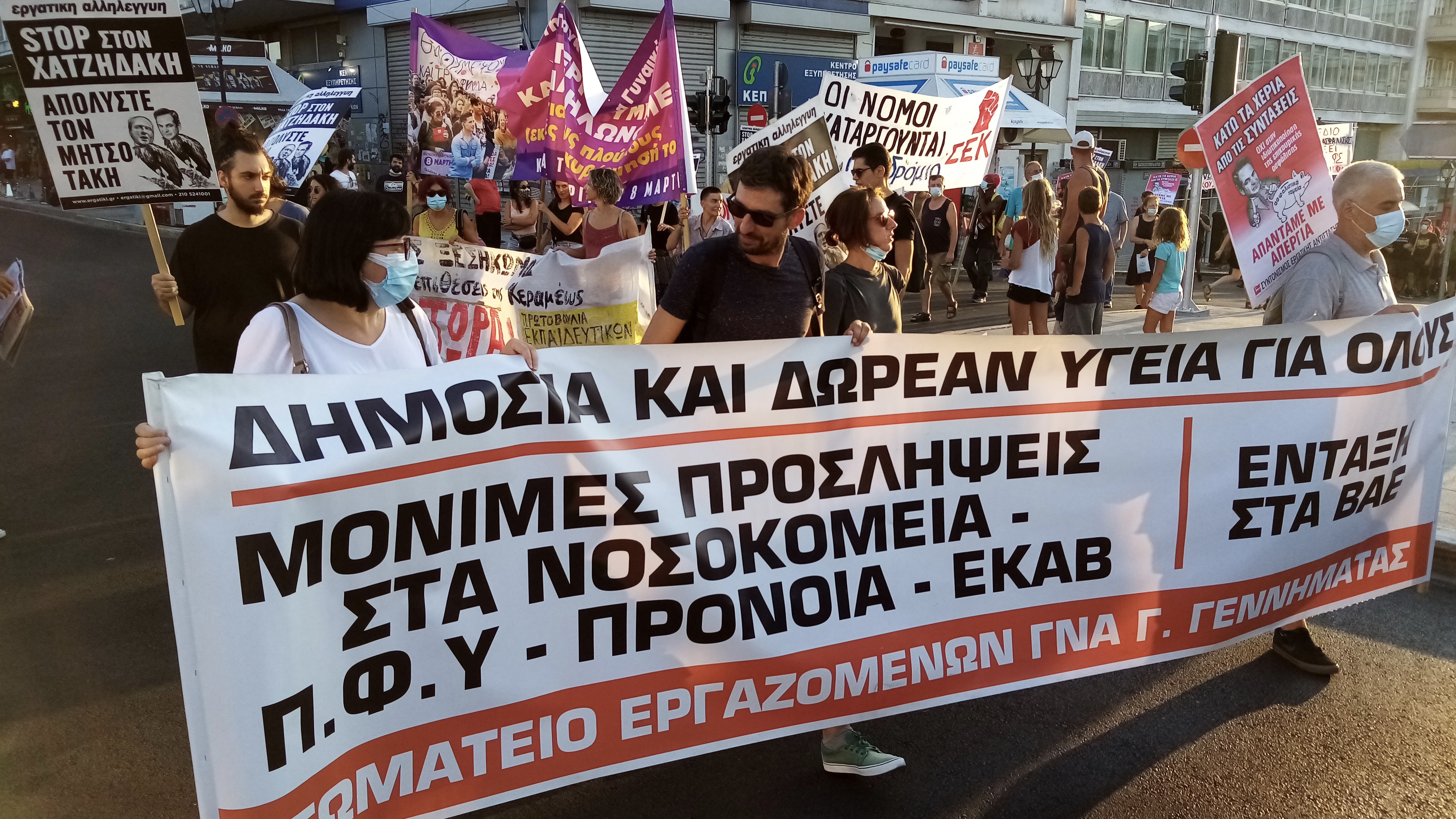 Νοσοκομειακοί από το Γ. Γεννηματά στην πορεία σήμερα Τετάρτη 1 Σεπτέμβρη από την πλατεία Κλαυθμώνος στο Σύνταγμα ενάντια στη ψήφιση του νομοσχεδίου για την επικουρική ασφάλιση. Φωτό Ε.Α,