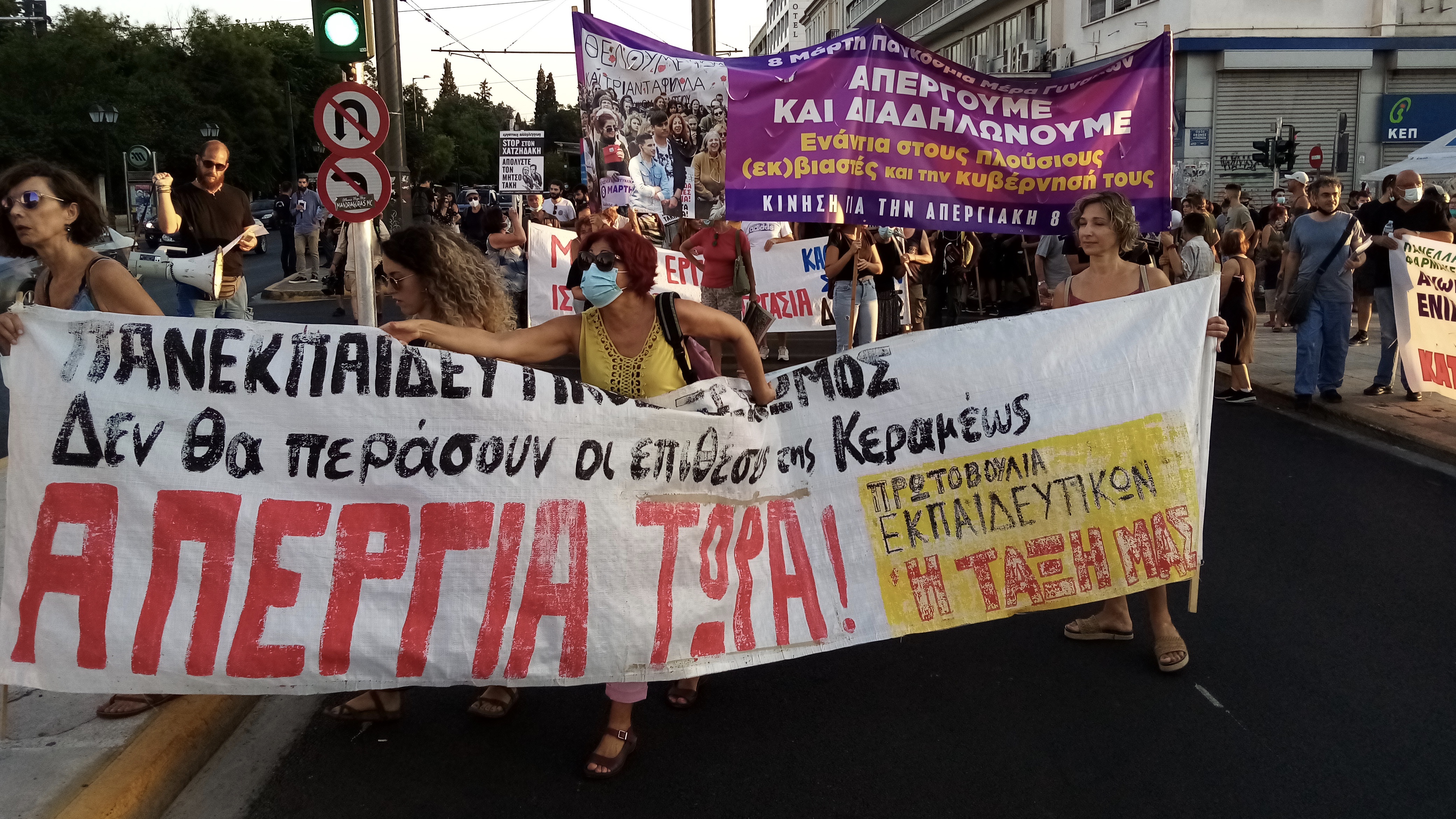 Εκπαιδευτικοί στην πορεία της Τετάρτης 1/9 από την πλατεία Κλαυθμώνος στο Σύνταγμα. Στην πορεία συμμετείχαν με τα πανό τους η Ταξική Πορεία, η Αντεπίθεση Εργαζομένων, ο Συντονισμός Εργατικής Αντίστασης, το ΣΕΚ, δικηγόροι, το Συντονιστικό Νοσοκομείων, η ΟΡΜΑ, φοιτητές κ.α. Φωτό Ε.Α.