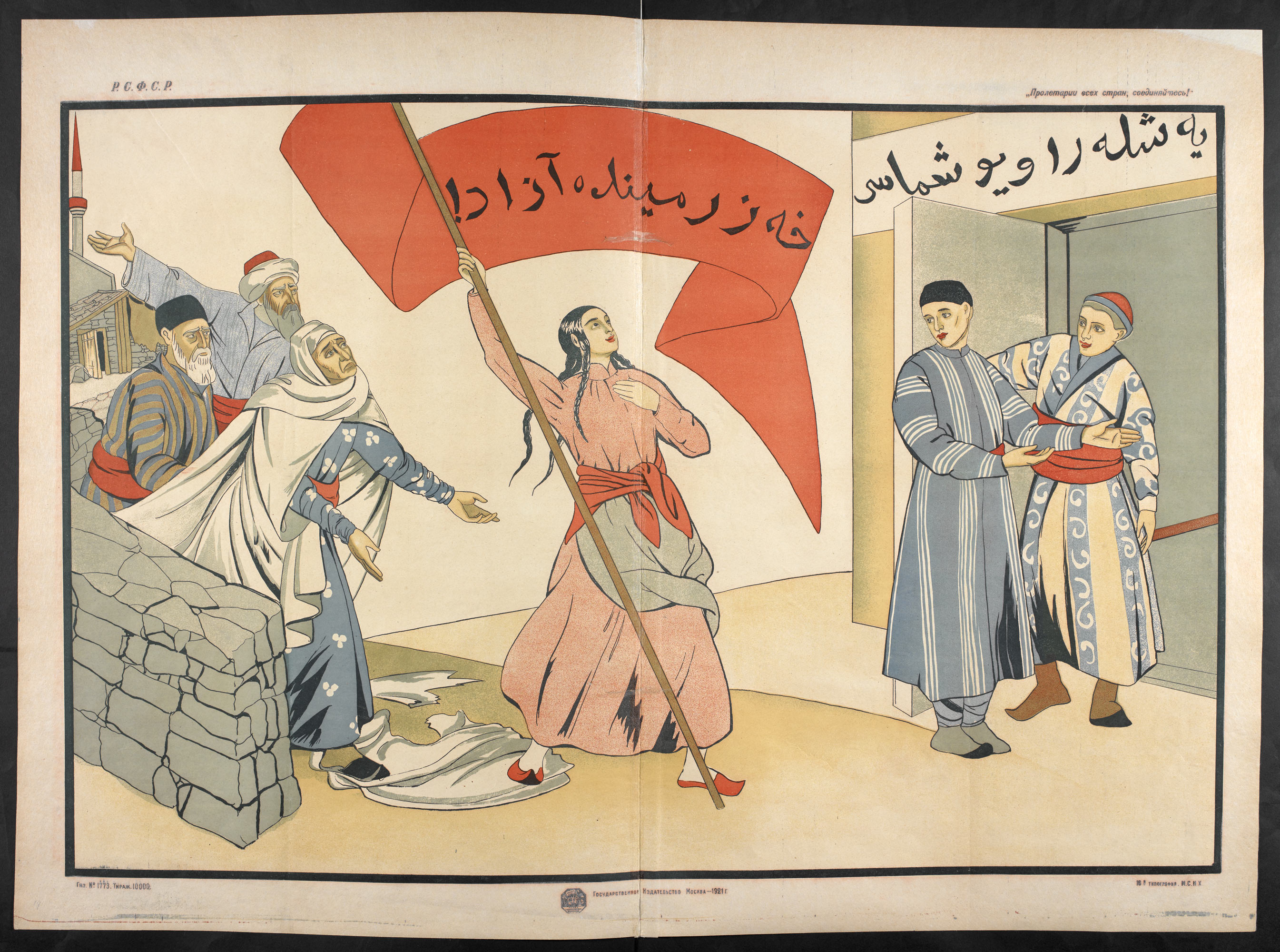 Προπαγανδιστική αφίσα της Σοβιετικής Δημοκρατίας (1921) στην ταταρική γλώσσα. Στην κόκκινη σημαία της νεαρής γυναίκας αναφέρεται “Τώρα είμαι ελεύθερη” και στα δεξιά δυο νέοι την προσκαλούν στη Λέσχη Νεολαίας. Αριστερά οι γονείς της και ο μουλάς την καλούν να γυρίσει πίσω.