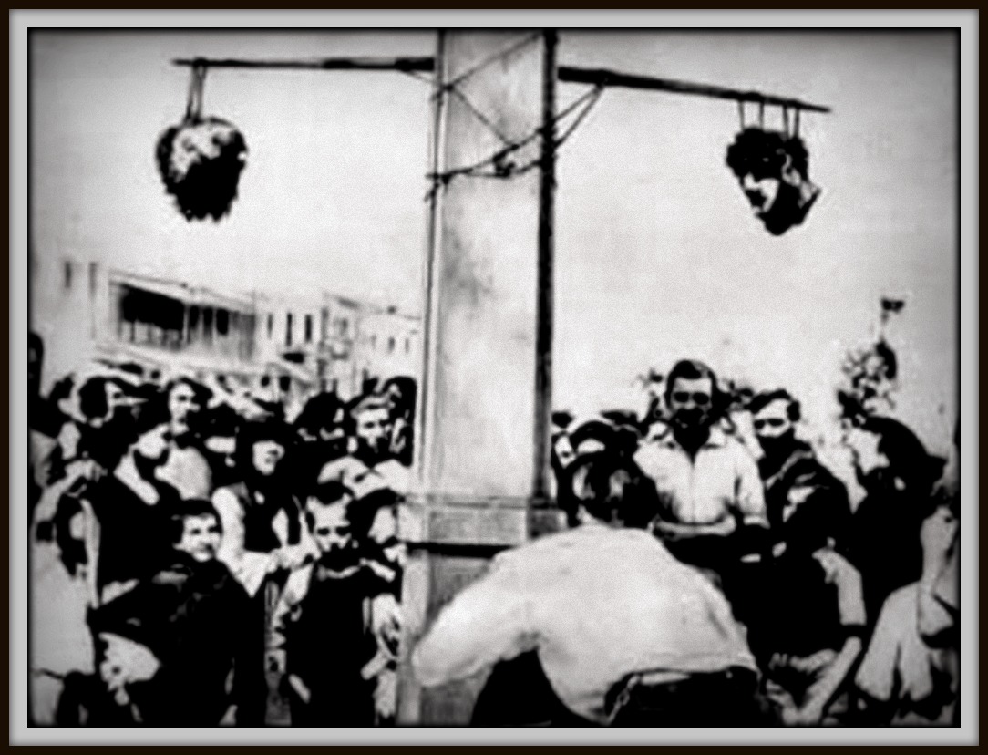 Τα αποκεφαλισμένα κεφάλια του Βελουχιώτη και του Τζαβέλα στην κεντρική πλατεία των Τρικάλων, Ιούνης 1945.