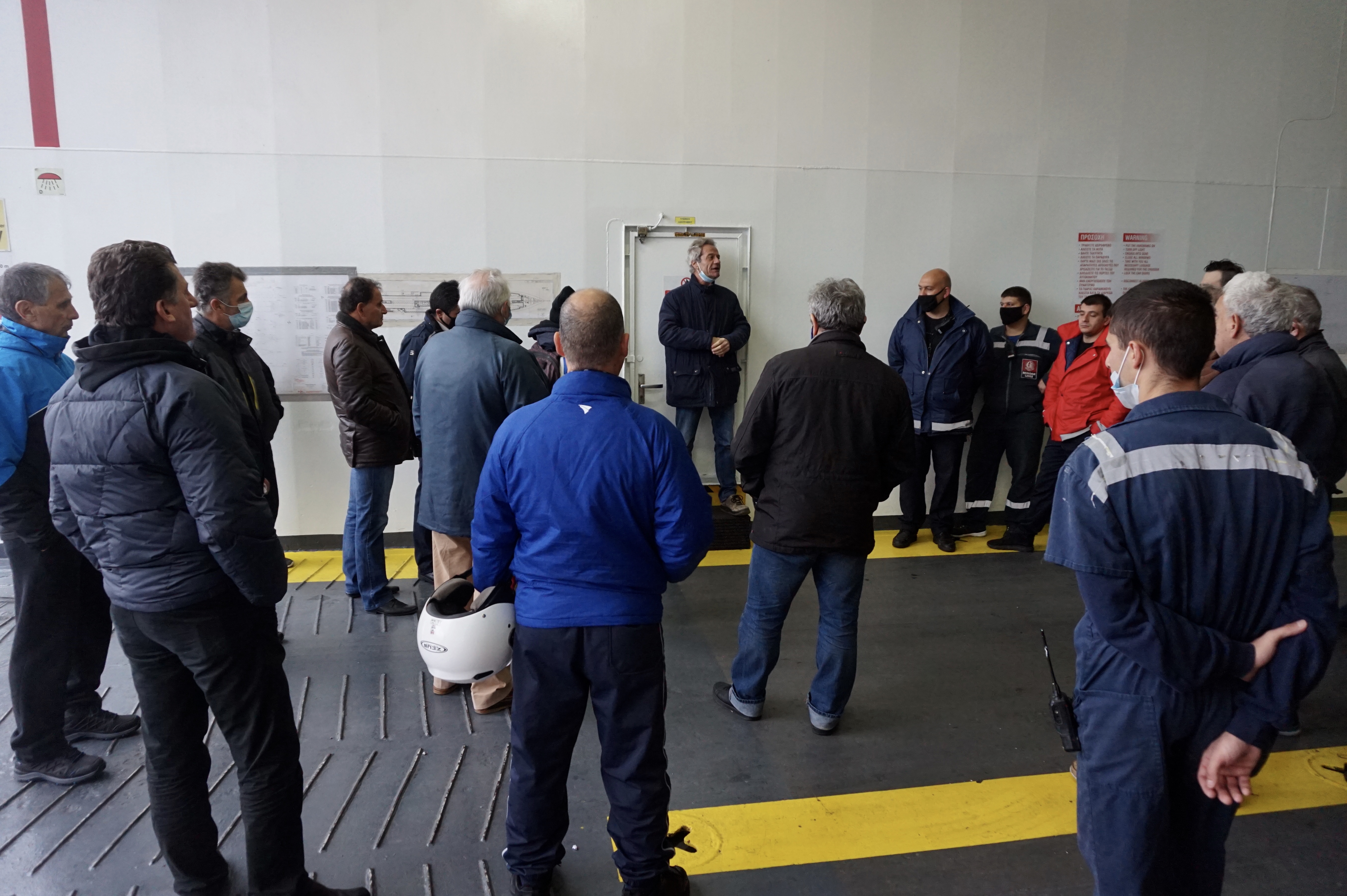 Η ναυτεργατική απεργία ξεκίνησε σήμερα Παρασκευή 01:00 με απόλυτη επιτυχία καθώς κανένα πλοίο δεν σαλπάρησε από τα λιμάνια της Ελλάδας. Τα ναυτεργατικά σωματεία ΠΕΝΕΝ, ΠΕΜΕΝ, ΣΤΕΦΕΝΣΩΝ, ΠΕΕΜΑΝ πραγματοποίησαν απεργιακές συγκεντρώσεις στα πλοία στο λιμάνι του Πειραιά. Στη φωτό ο Πρόεδρος της ΠΕΝΕΝ Α. Νταλακογεώργος σε ομιλία και συζήτηση με ναυτεργάτες στο “Φαιστός” σήμερα το πρωί. Φωτό Ε.Α.