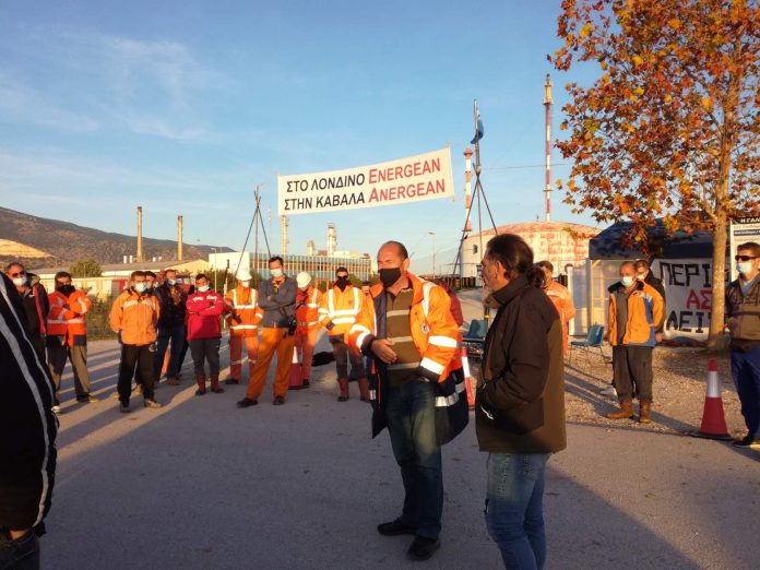 Περιφρούρηση εργαζομένων στο εργοστάσιο της Καβάλα Όϊλ. (Φωτό e-tipos)
