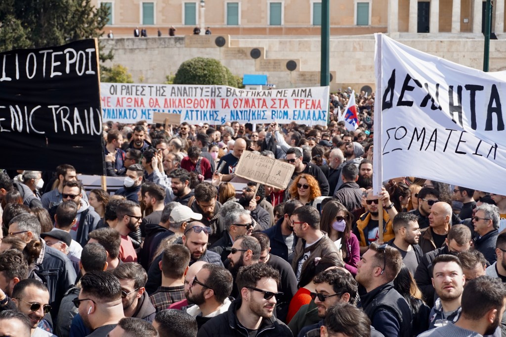 Στην Αθήνα πάνω από 7.000 φοιτητές/τριες και μαθητές/τριες συμμετείχαν σε δυναμική πορεία, από τα Προπύλαια στη Βουλή και στα γραφεία της Hellenic Train που κάλεσαν το ΜΑΣ και η ΚΝΕ, με πολλά αυτοσχέδια πανό και πλακάτ και συνεχή συνθήματα όπως,“Τα κέρδη τους – Οι νεκροί μας”, “Το έγκλημα αυτό να μην συγκαλυφθεί! – Όλων των νεκρών θα γίνουμε φωνή!”, Προδιαγεγραμμένο έγκλημα κι ένοχοι γνωστοί – Ποτάμι να τους πνίξει να γίνει η οργή!”, “ ‘Το πάμε κι όπου βγει’ δεν βγαίνει πουθενά, μόνο τραγωδίες το σύστημα γεννά”.