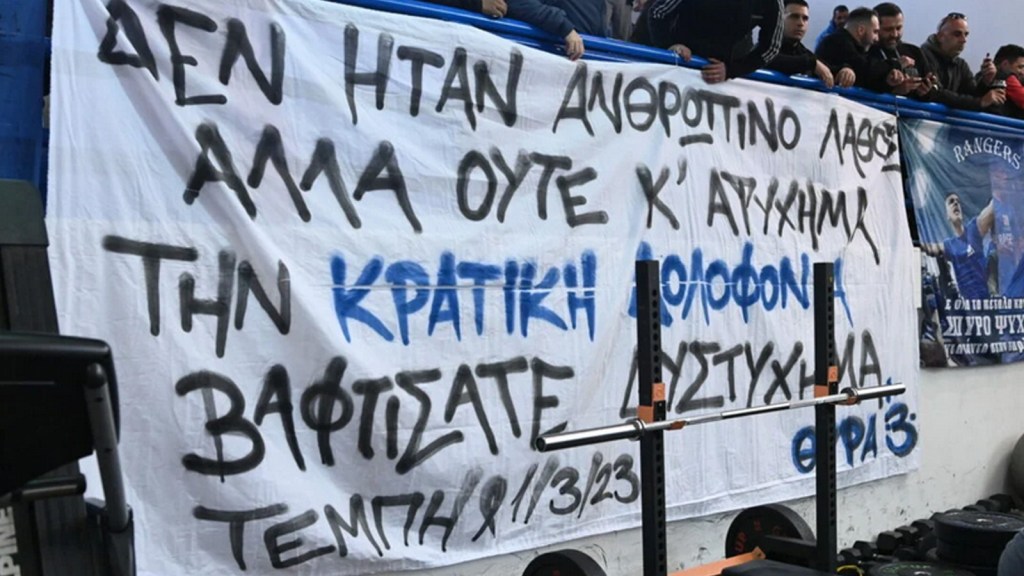 Πανό οργής, αποφασιστικότητας και αγώνα στον αγώνα μπάσκετ τής Κυριακής Ιωνικός – ΑΕΚ. Νεολαία, φίλαθλοι, εργάτες ενωμένοι για την ανατροπή της λαομίσητης μνημονιακής χούντας Μητσοτάκη! (Φωτο Γιώργος Ματθαίος)