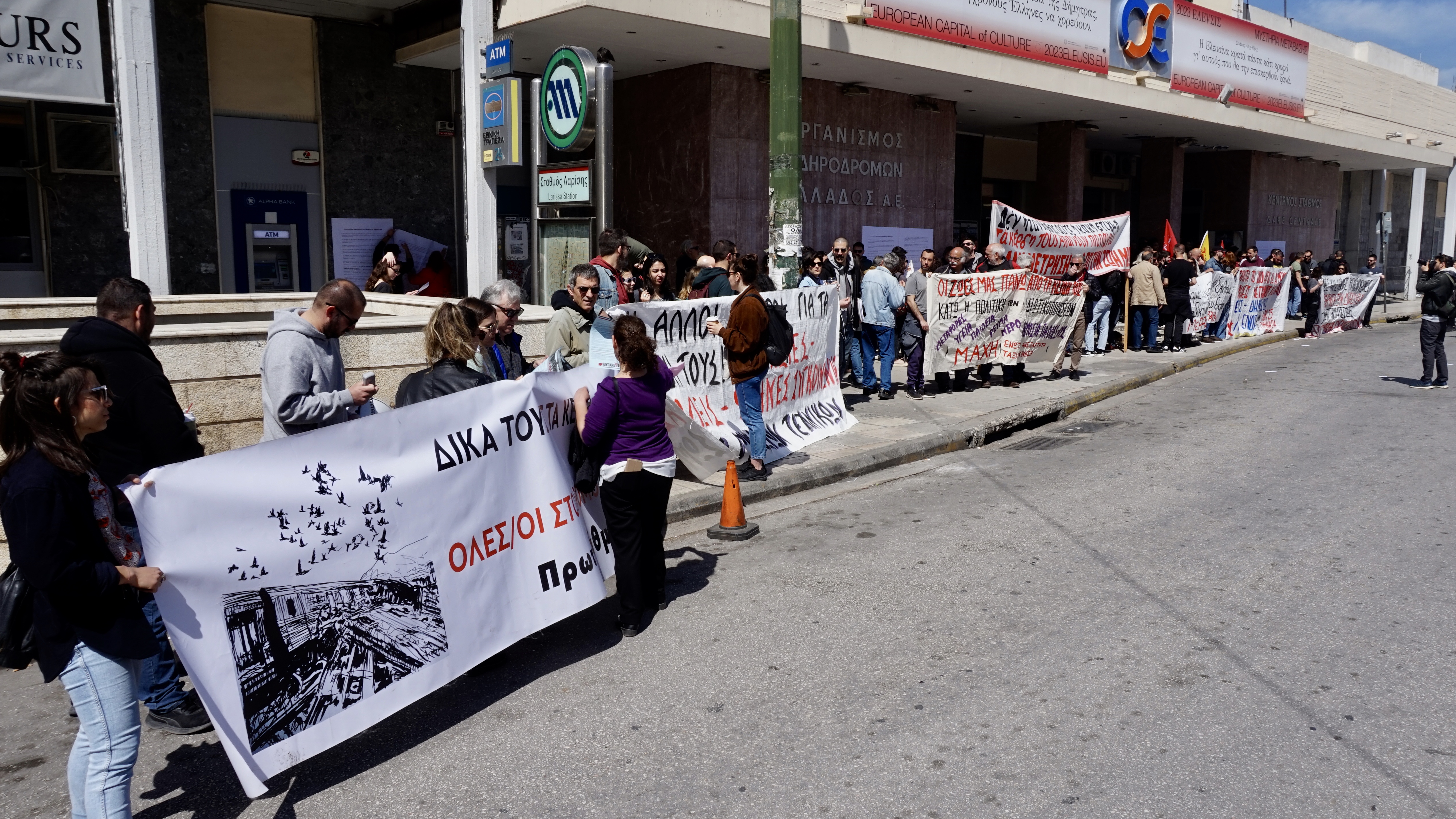 Από την κινητοποίηση εργατικών σωματείων, φοιτητικών συλλόγων και συνδικαλιστικών παρατάξεων στο Σταθμό Λάρισας, Αθήνα, το Σάββατο ενάντια στην επαναλειτουργία των τρένων χωρίς τα σωστά μέτρα ασφάλειας. Φωτό Ε.Α.)