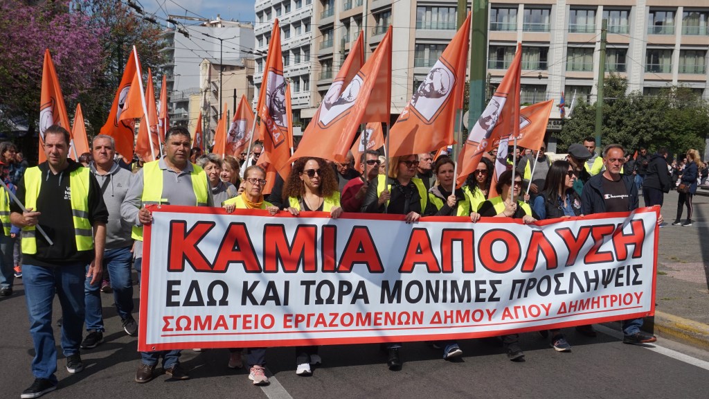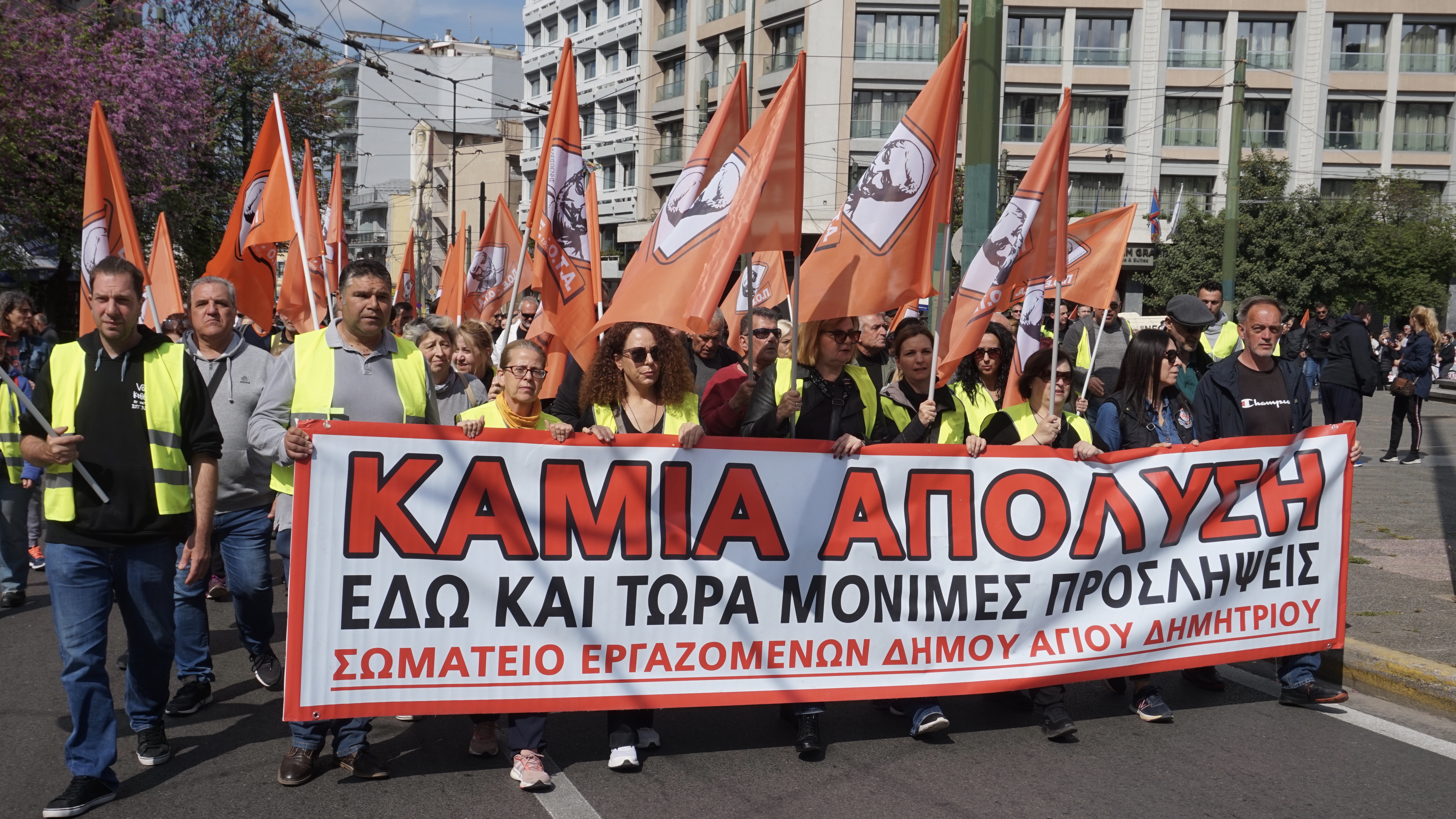 Το πανό του Σωματείου Εργαζομένων Δήμου Αγ. Δημητρίου στη σημερινή απεργιακή πορεία. (Φωτο Ε.Α.)