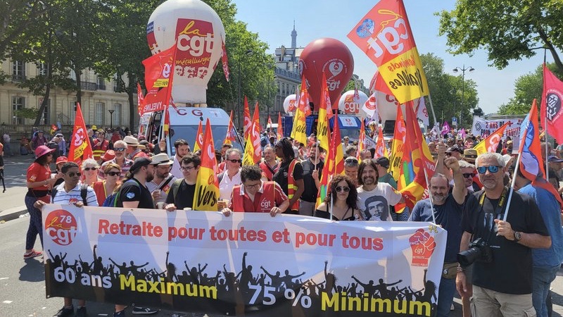Από τις τεράστιες πορείες στη Γαλλία στις 6 Ιούνη ενάντια στην κυβέρνηση του Προέδρου Μακρόν, εδώ αντιπροσωπεία του ιταλικού συνδικάτου USB. Οι ηγεσίες των γαλλικών συνδικάτων αρνούνται να καλέσουν για την ανατροπή του Μακρόν, αλλά η εργατική τάξη συνεχίζει τον αγώνα της όπως και οι συνάδελφοι της σε Ελλάδα, Γερμανία, Βρετανία, κ.α. (Φωτο USB)