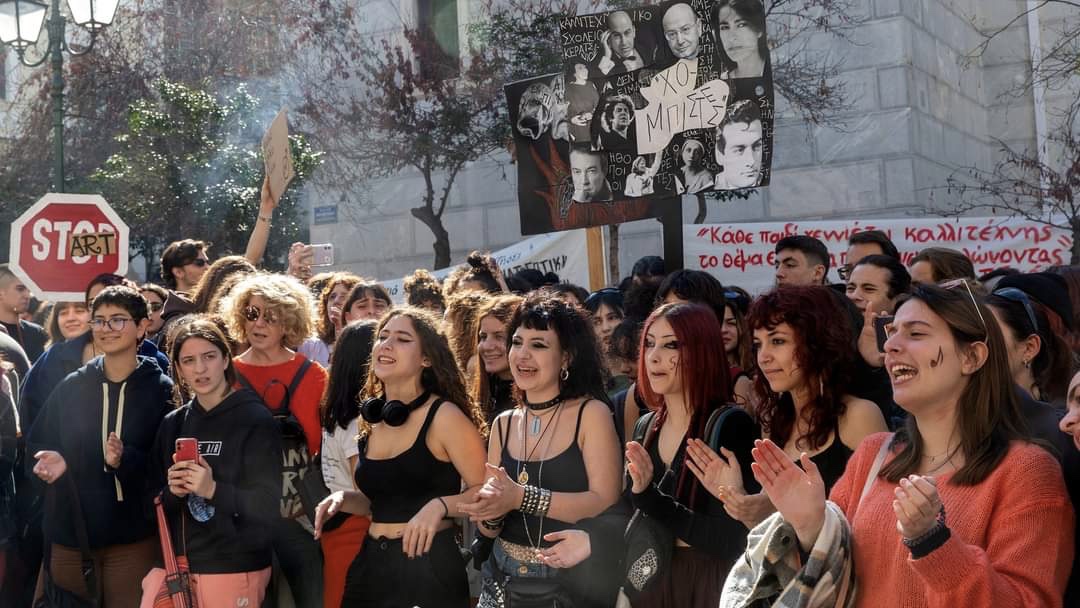 Από συγκέντρωση στην κατάληψη του Εθνικού Θέατρου στην Αθήνα 25/2/2023. (Φωτό Μάριος Λώλος)
