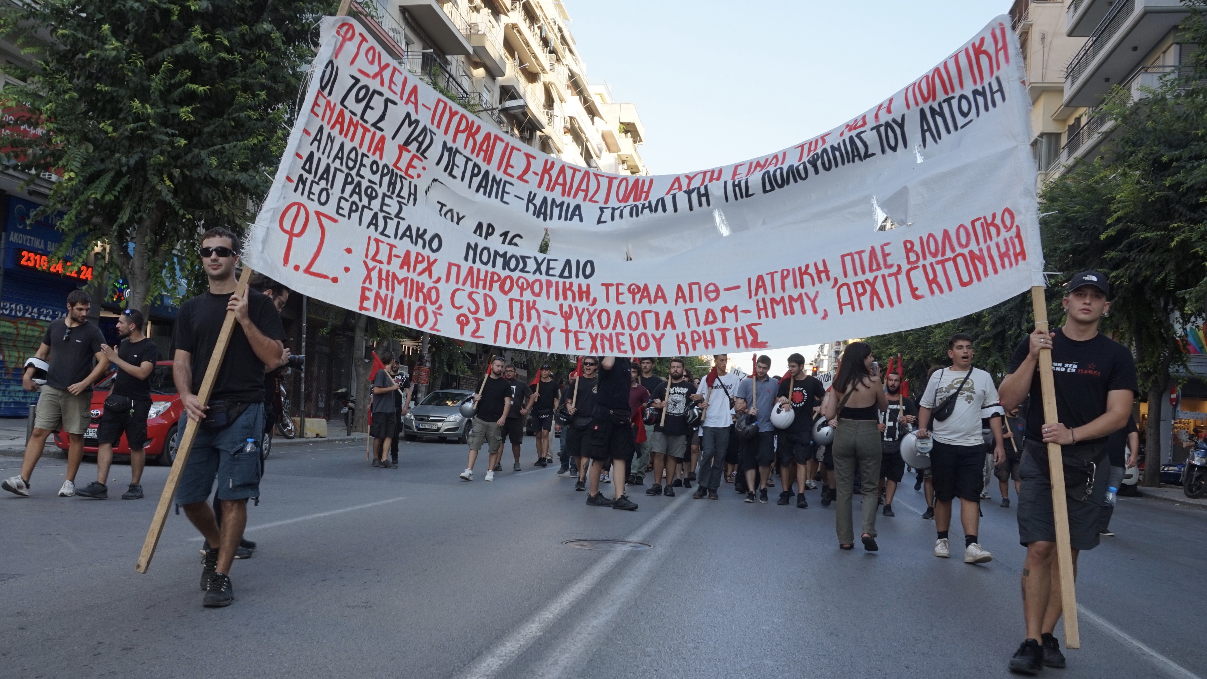 Το φοιτητικό πανό και μπλοκ που ξεκίνησε από την Καμάρα, μαζί με αντιπροσωπείες συνδικαλιστικών παρατάξεων, σε πορεία στη Θεσσαλονίκη Σαββάτο βράδυ. (Φωτο Ε.Α.)