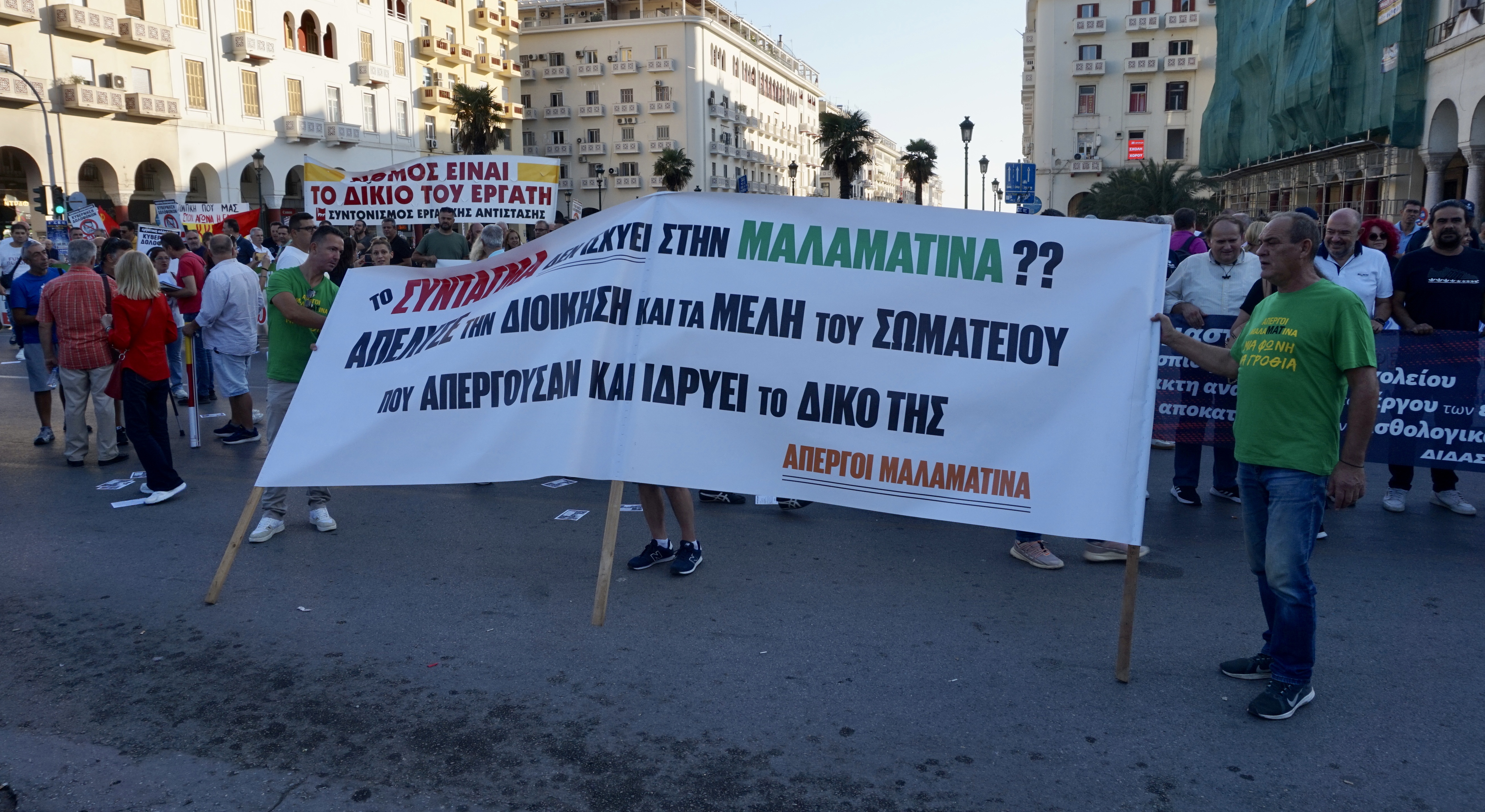 Το πανό των απεργών στην οινοποιία “Μαλαματίνα” Θεσσαλονίκης στη συγκέντρωση ΓΣΕΕ ΑΔΕΔΥ στη Θεσσαλονίκη. (Φωτο Ε.Α.)