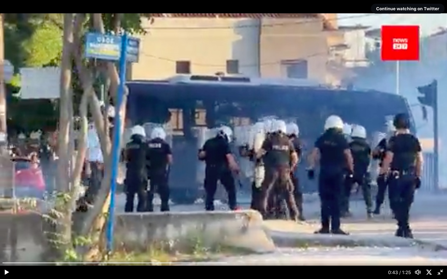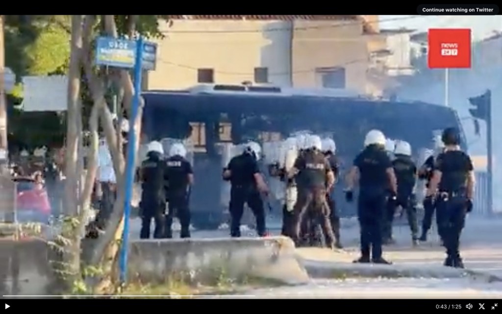 Εικόνα από βίντεο που δημοσιεύει ο News 24/7 από την επίθεση με χημικά των ΜΑΤ σήμερα Κυριακή 6:30 μ.μ. ενάντια σε διαμαρτυρόμενους πολίτες στη Λάρισα για την επίσκεψη Μητσοτάκη. Τα ΜΑΤ καταδίωξαν τους διαδηλωτές και πραγματοποίησαν “προσαγωγές”.