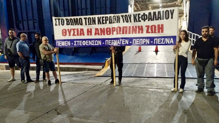Το πανό των ΠΕΜΕΜΝ Στέφενσων κ.α. στη σημερινή απεργία στο λιμάνι του Πειραιά. (Φωτο 902.gr)