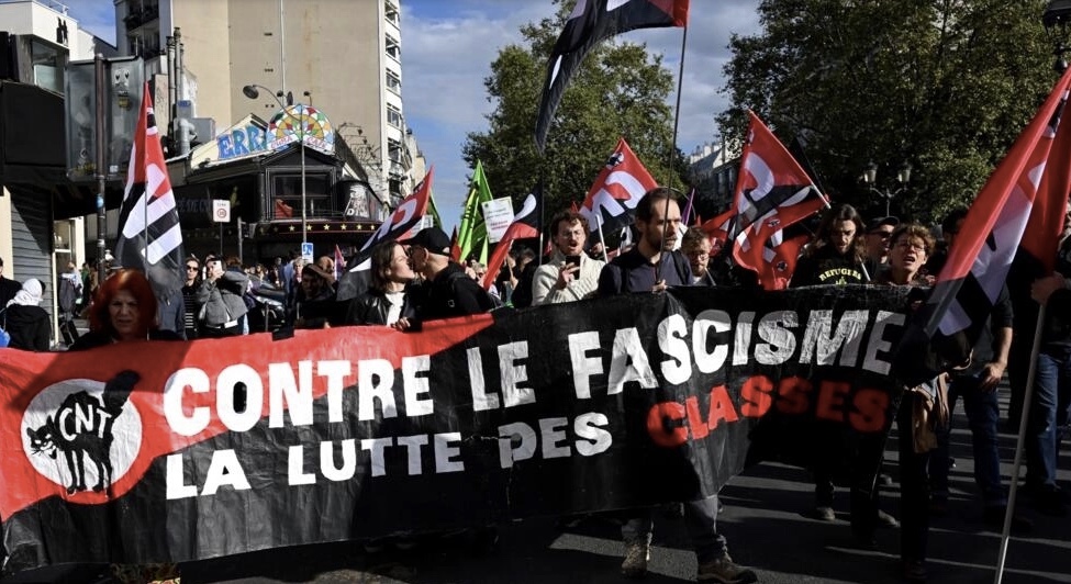 Το πανό της εργατικής ομοσπονδίας CNT στη διαδήλωση του Σαββάτου στο Παρίσι. Το πανό αναφέρει, “Ενάντια στο φασισμό, η ταξική πάλη”. (Φωτο Bertrand Guay)