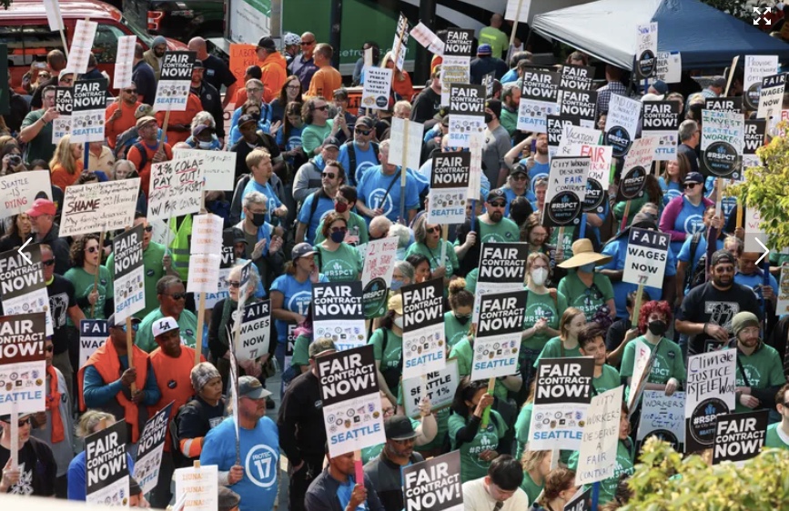 Από την απεργιακή συγκέντρωση 19/9 των υπαλλήλων του Δήμου Σιάτλ που διεκδικούν βελτιωμένες νέες συλλογικές συμβάσεις εργασίας. (Φωτο Seattle Times)