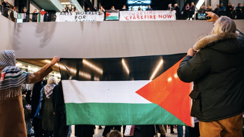 Η καλλιτεχνική συλλογικότητα Occupy Tate Modern (Κατάληψη του μουσείου Τέϊτ Μόντερν) απαιτεί μόνιμη κατάπαυση του πυρός στη Γάζα.