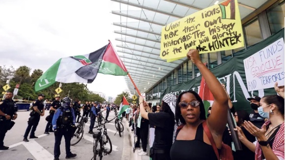 Πάνω από 100 καλλιτέχνες και μέλη της συλλογικότητας South Florida Coalition for Palestine (ΕΠΑ) διαδήλωσαν στις 9/12/2023 έξω από την έκθεση της Art Basel στο Μαϊάμι Μπιτς ενάντια στη γενοκτονία του Ισραήλ στη Γάζα.