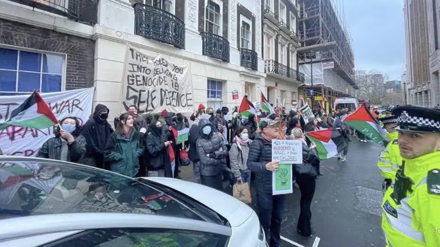 Φοιτητές/τριες και εργαζόμενοι/ες τής συλλογικότητας Art Workers for Palestine διαδήλωσαν στις 14/12/2023 στην Royal Academy of Arts, Λονδίνο, ενάντια στην παρουσία στo ίδρυμα του Ισραηλινού Πρεσβευτή. (Φωτο Art Workers for Palestine/ Evening Standard)