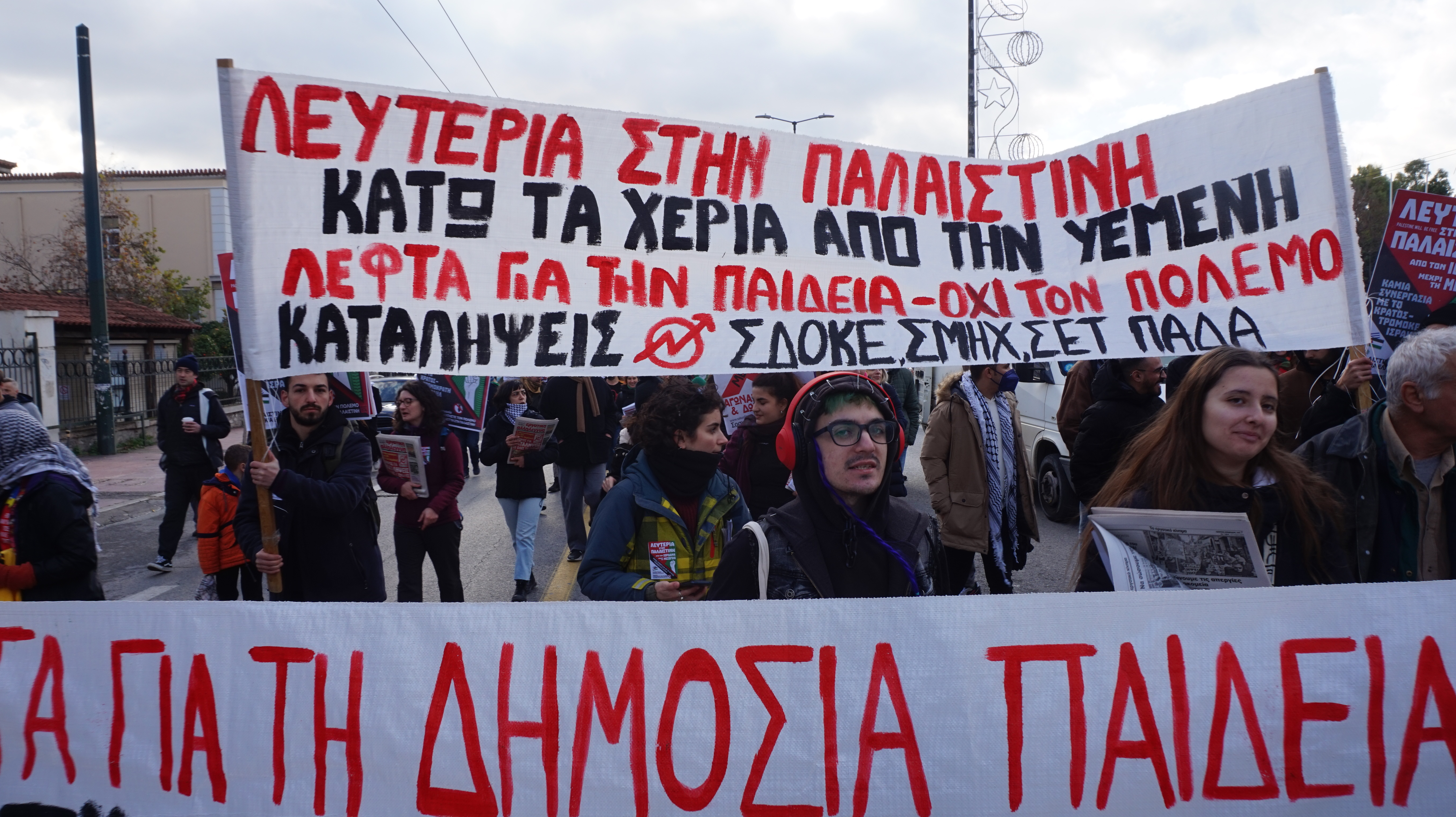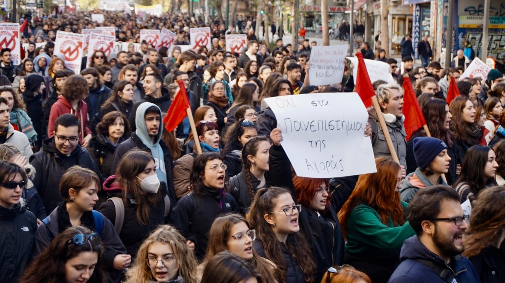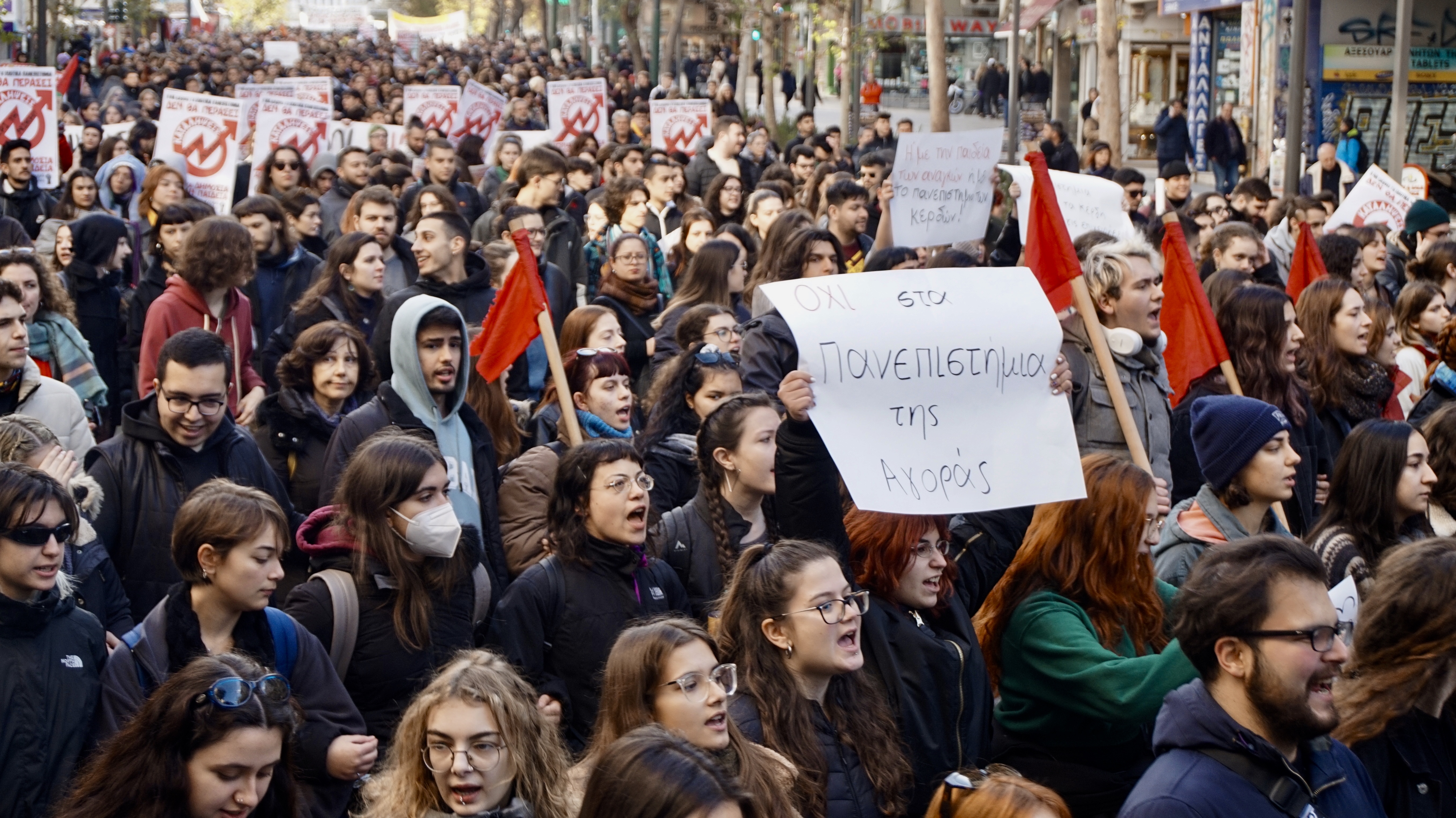 Από τη φοιτητική – μαθητική πορεία 15.000 στην Αθήνα την περασμένη Πέμπτη. Οι φοιτητικοί σύλλογοι προχώρησαν σε καταλήψεις πάνω από 100 σχολών και θα πραγματοποιήσουν νέα πορεία την ερχόμενη Πέμπτη ενάντια στην ίδρυση ιδιωτικών πανεπιστημίων. Καλούν εκπαιδευτικούς και εργατικά σωματεία στις πορείες. Είναι ώρα για οργάνωση Γενικής Πολιτικής Απεργίας Διαρκείας για την ανατροπή της μνημονιακής κοινοβουλευτικής χούντας Μητσοτάκη. (Φωτο Ε.Α.)