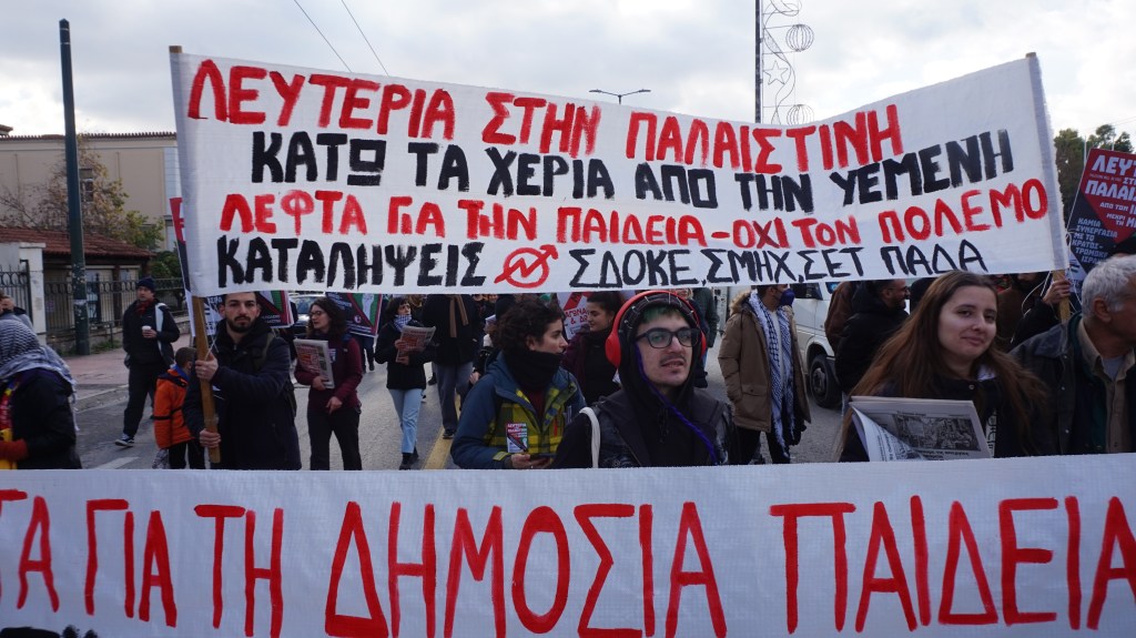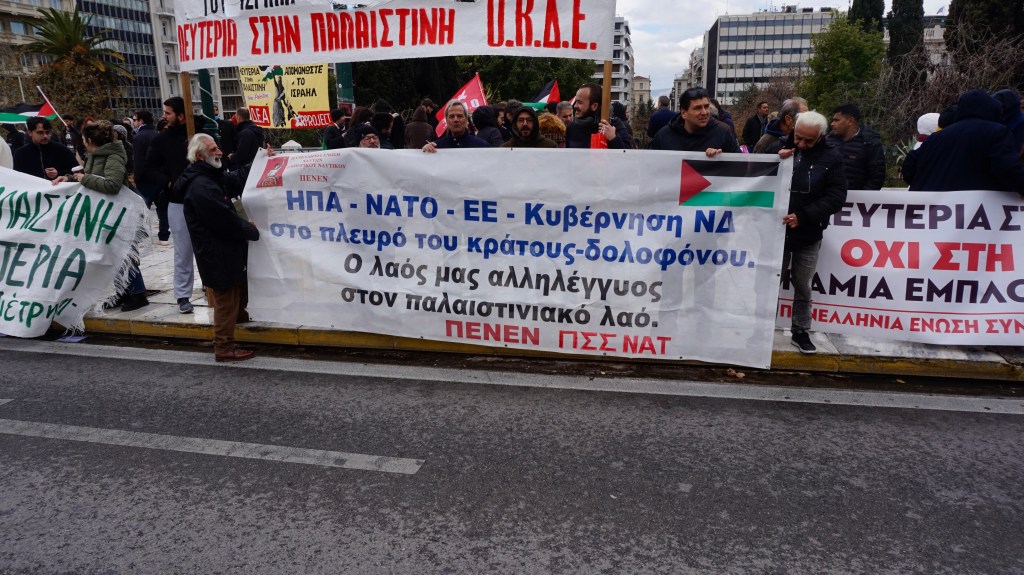 Από τη χτεσινή πορεία στην Αμερικανική και Ισραηλινή Πρεσβείες που οργάνωσαν η Συμμαχία Σταματήστε τον Πόλεμο – Αλληλεγγύη στην Παλαιστίνη και η Παλαιστινιακή Παροικία στην Ελλάδα, με συμμετοχή του Μ-Λ ΚΚΕ και άλλων κομμάτων. (Φωτο Ε.Α.)