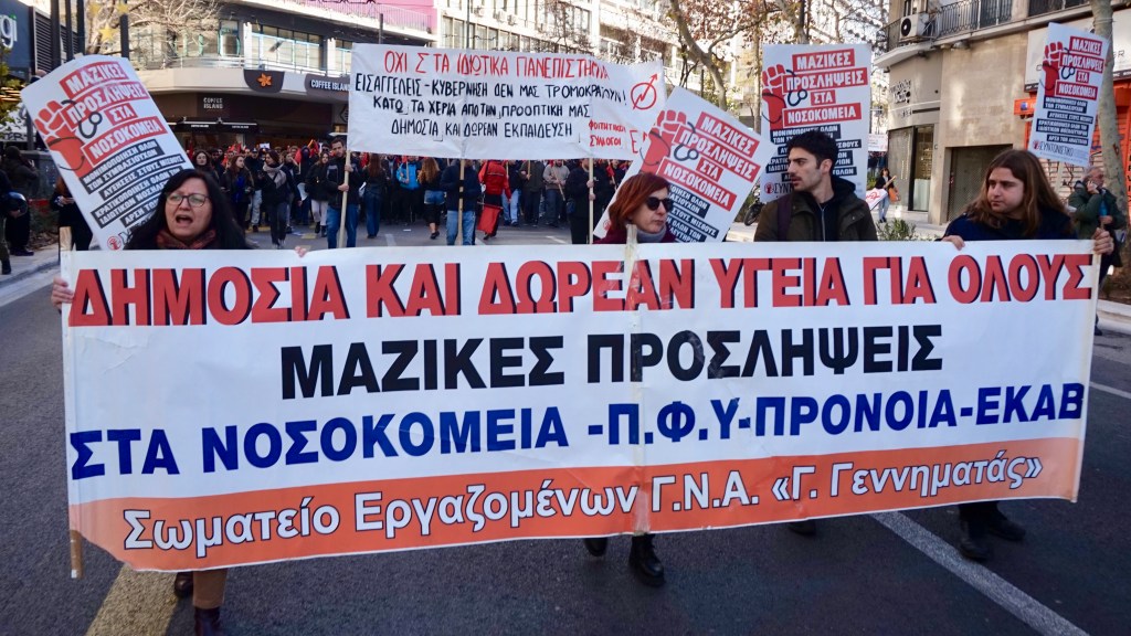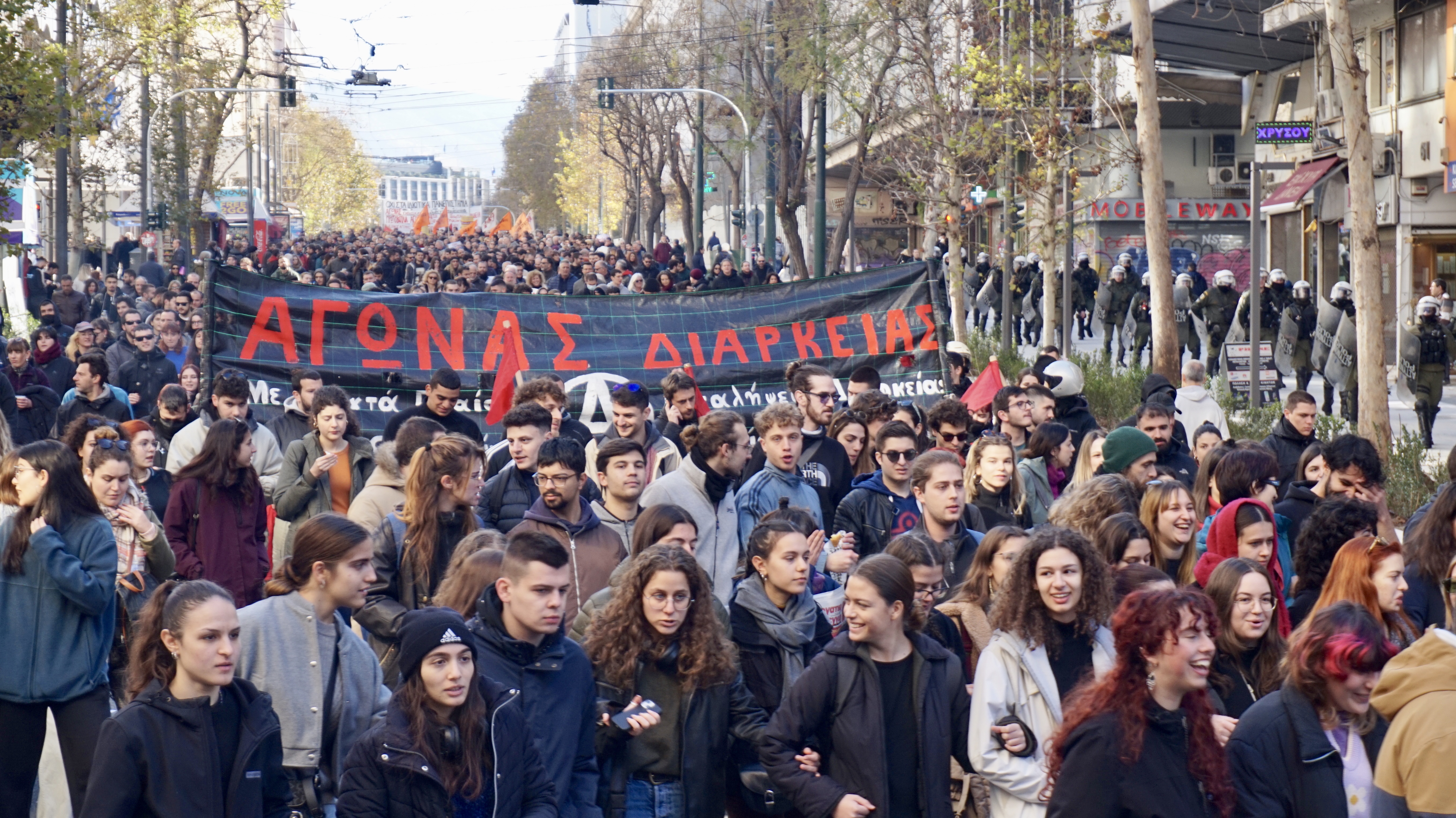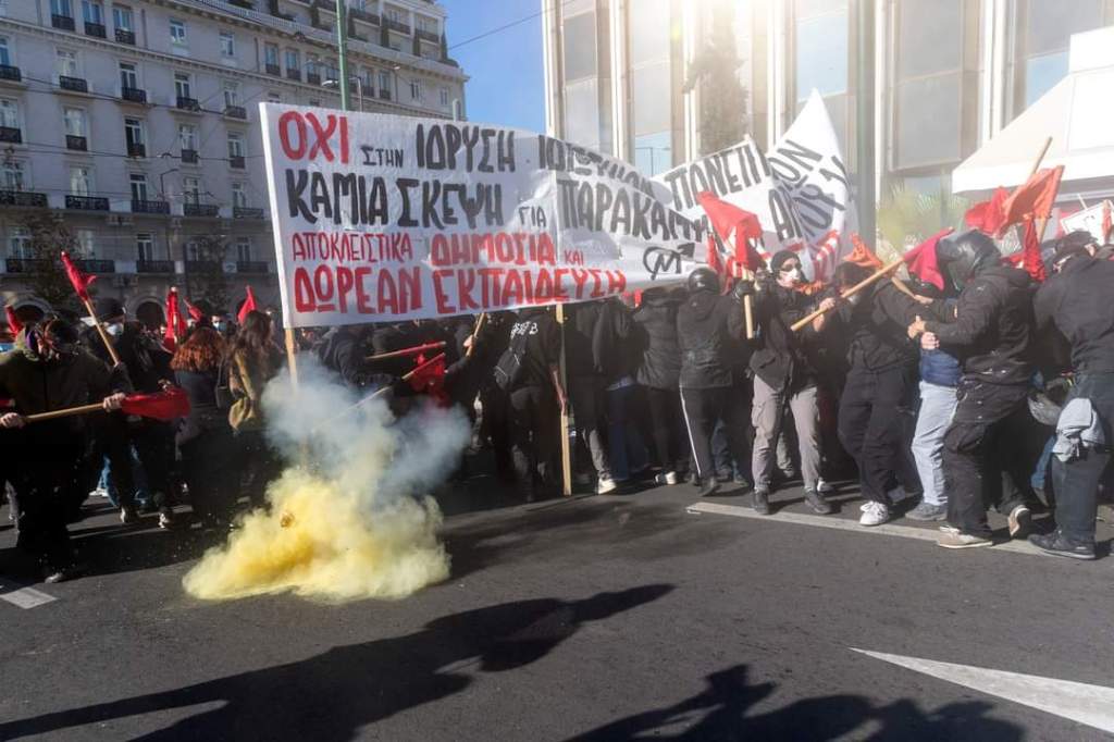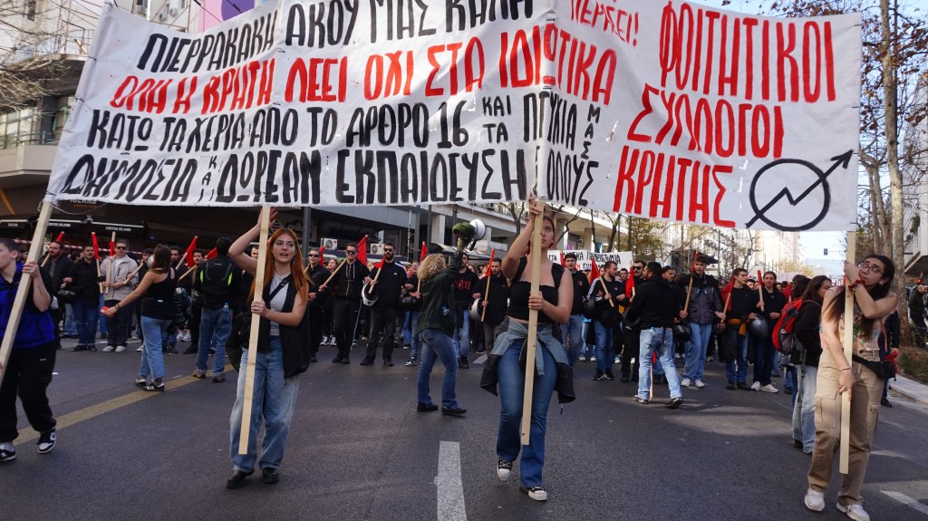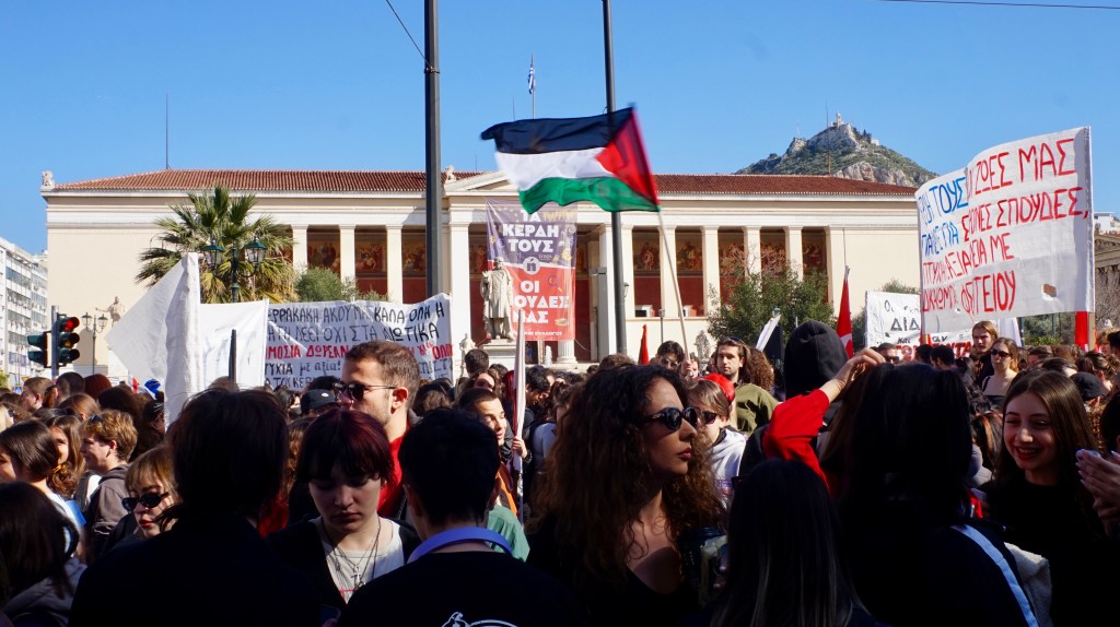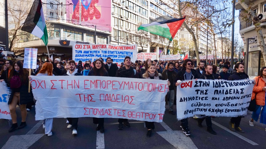 Οι εργαζόμενοι και οι φοιτητές, μαθητές απαίτησαν σήμερα ΚΛΙΜΑΚΩΣΗ ΤΩΡΑ για να μη ψηφιστεί το νομοσχέδιο για τα ιδιωτικά πανεπιστήμια, για να αποσυρθούν τα σχέδια για απογευματινά χειρουργεία, για αυξήσεις και συλλογικές συμβάσεις, για προσλήψεις σε νοσοκομεία και δημόσιους οργανισμούς, όχι στη συμμετοχή στον πόλεμο ενάντια στους Παλαιστινίους!