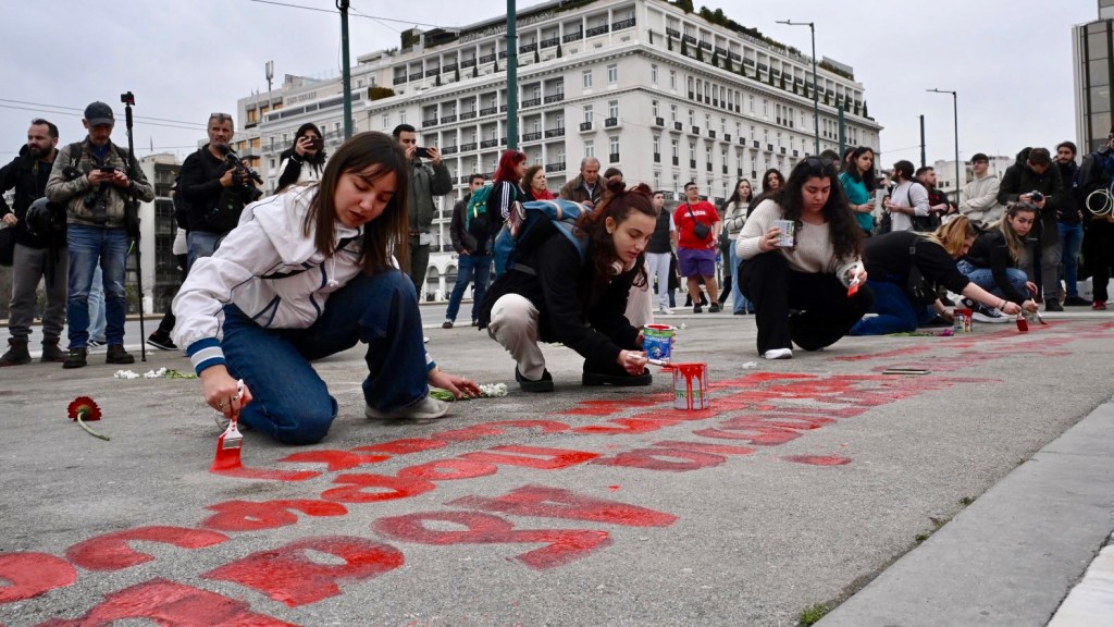 Μπροστά απ’ τη Βουλή φοιτήτριες έγραψαν ξανά τα ονόματα των 57 θυμάτων του εγκλήματος των Τεμπών.