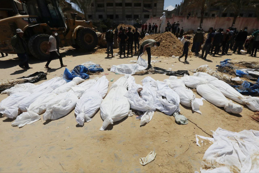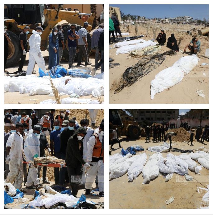 Σοροί Παλαιστινίων στους μαζικούς τάφους του ισραηλινού στρατού γύρω από το νοσοκομείο Αλ Σίφα. Έχουν βρεθεί 500 πτώματα. (Φωτο WAFA 24/4/24)