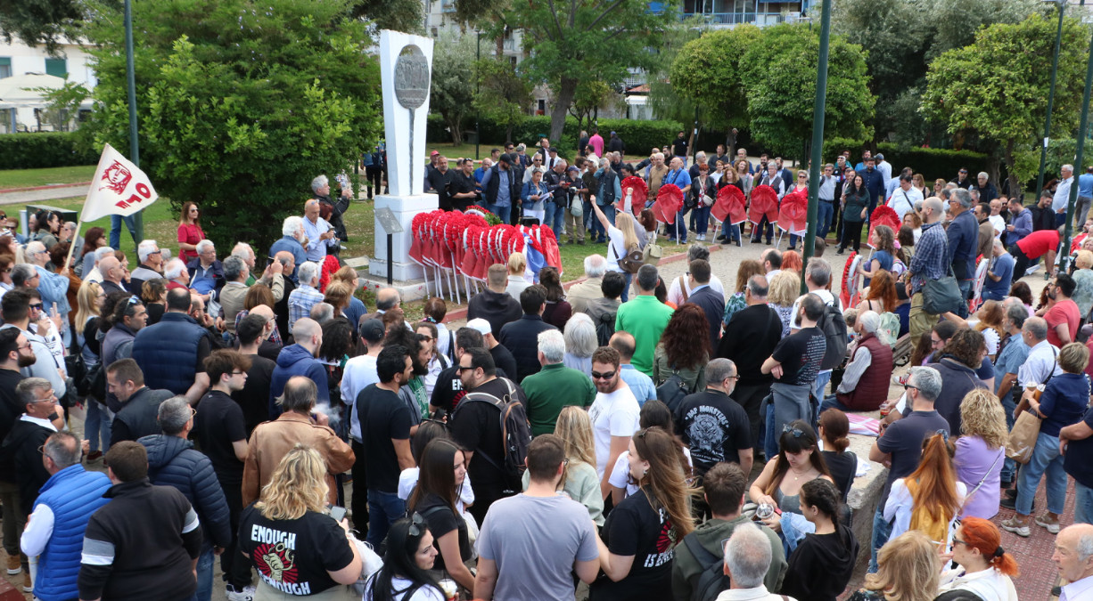 Από την απεργιακή συγκέντρωση της Πρωτομαγιάς στον Πειραιά που οργάνωσε το ΕΚΠ. Κατάθεση στεφανιών στο Μνημείο των 11 δολοφονημένων εργατών της Γενικής Απεργίας, 23 Αυγούστου 1923 στο Πασαλιμάνι. (Φωτο ΠΕΝΕΝ)