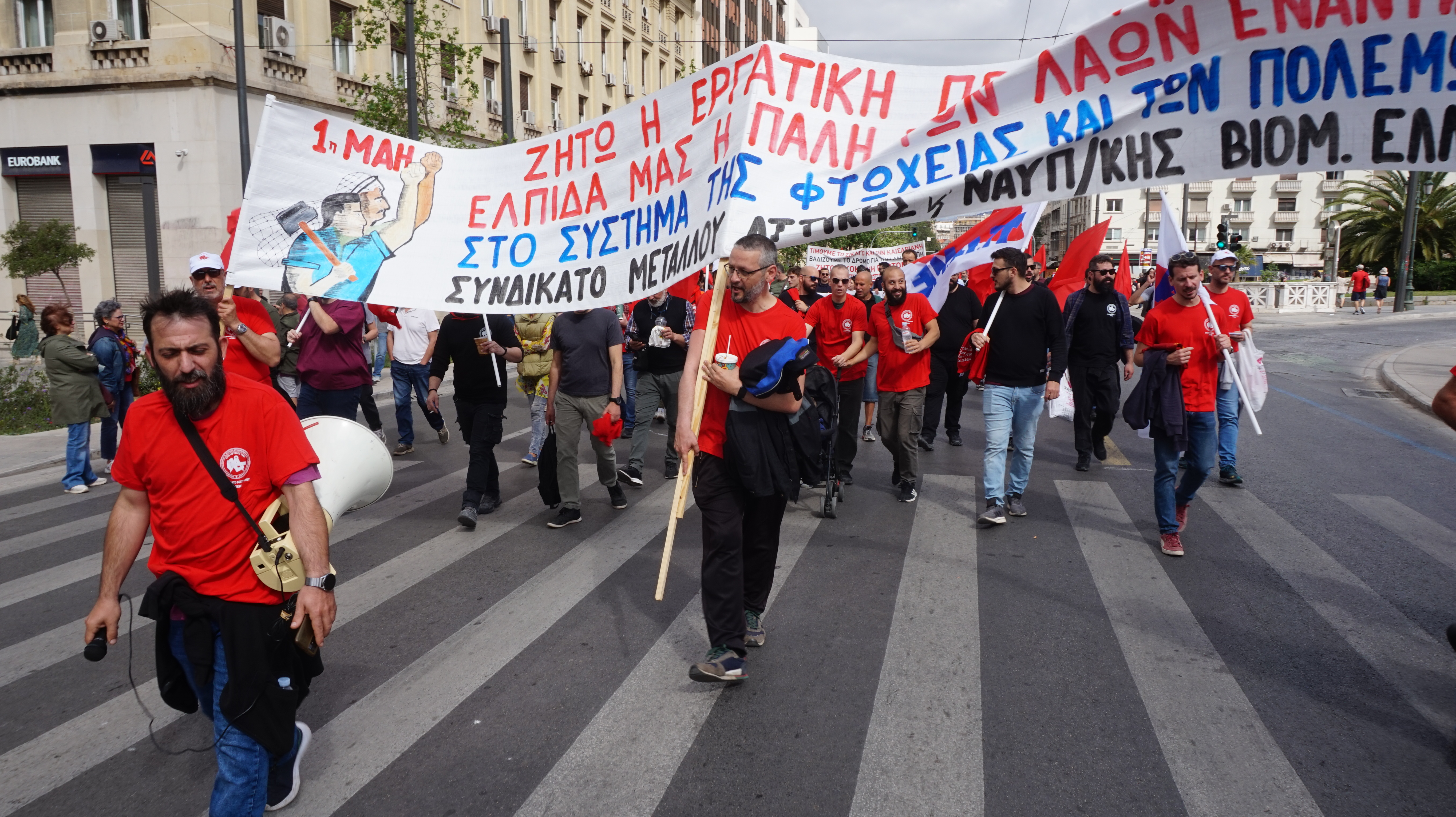 Πανό του ΦΣ Βιολογικού στην απεργιακή Πρωτομαγιάτικη πορεία από τα Προπύλαια στη Βουλή. (Φωτο Ε.Α.)