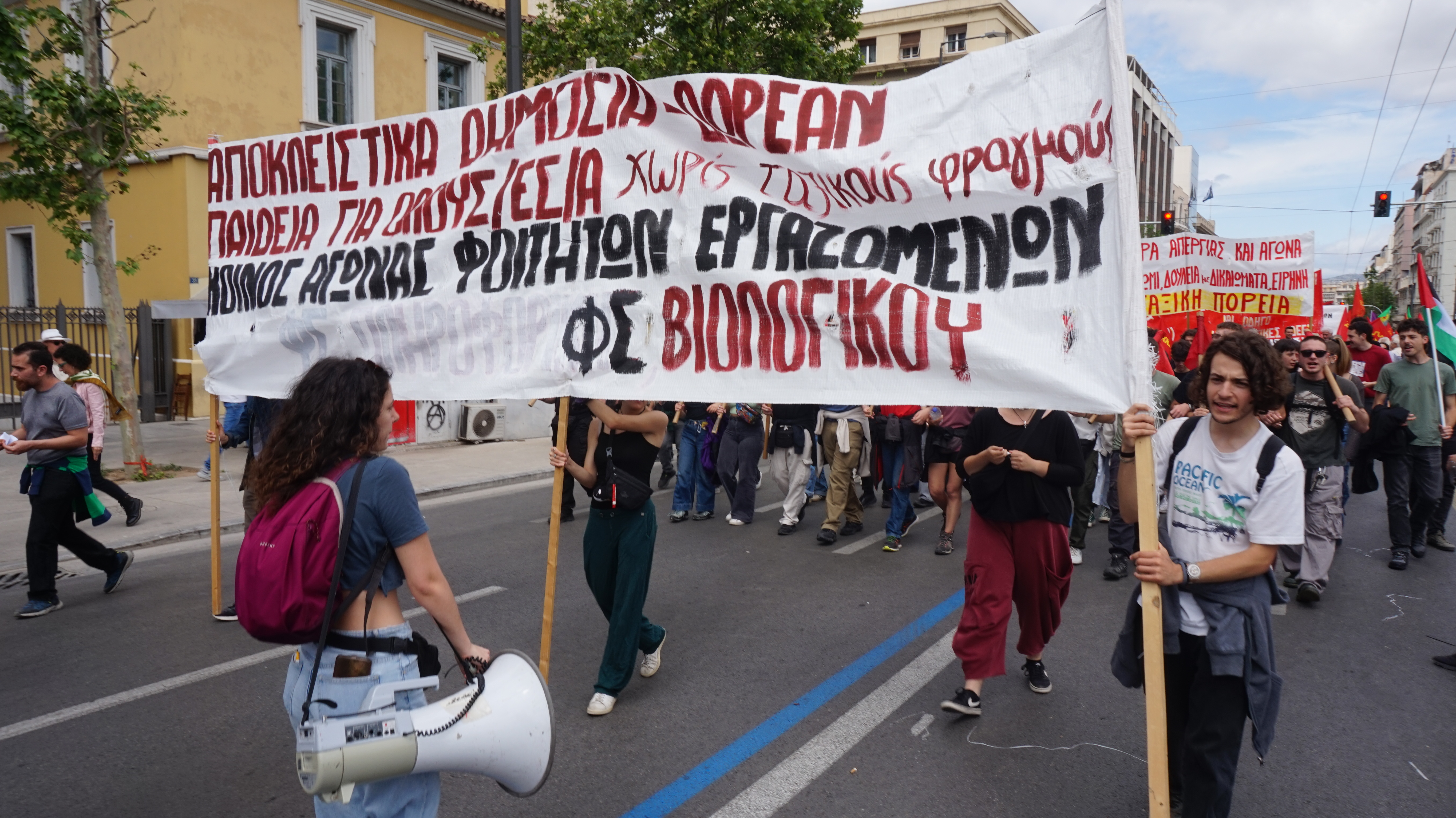Φοιτητικό πανό στην απεργιακή πορεία της Πρωτομαγιάς στην Αθήνα. (Φωτο Ε.Α.)
