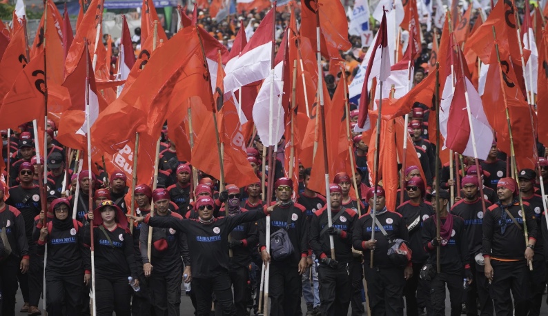 Από την Πρωτομαγιάτικη πορεία στην Τζακάρτα, πρωτεύουσα της Ινδονησίας. Τεράστιες πορείες πραγματοποιήθηκαν στις Φιλιπίνες, Ν. Κορέα και στα κράτη της ανατολικής Ασίας. (Φωτο Achmad Imrahim)