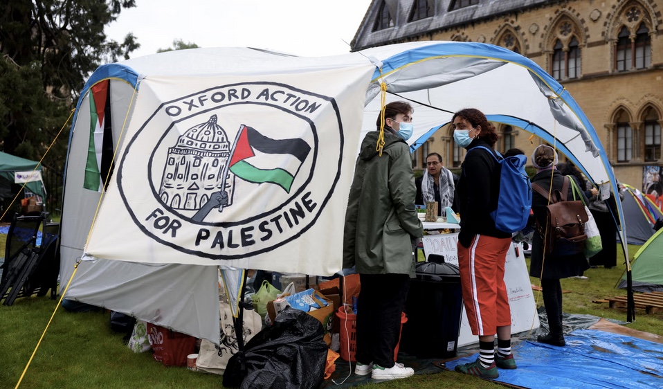 Καταυλισμός σκηνών στήθηκε από φοιτητές/τριες στην Οξφόρδη. Επίσης στα πανεπιστήμια Κέμπριτζ, ΣΟΑΣ Λονδίνου κ.α. (Φωτο The News Line)