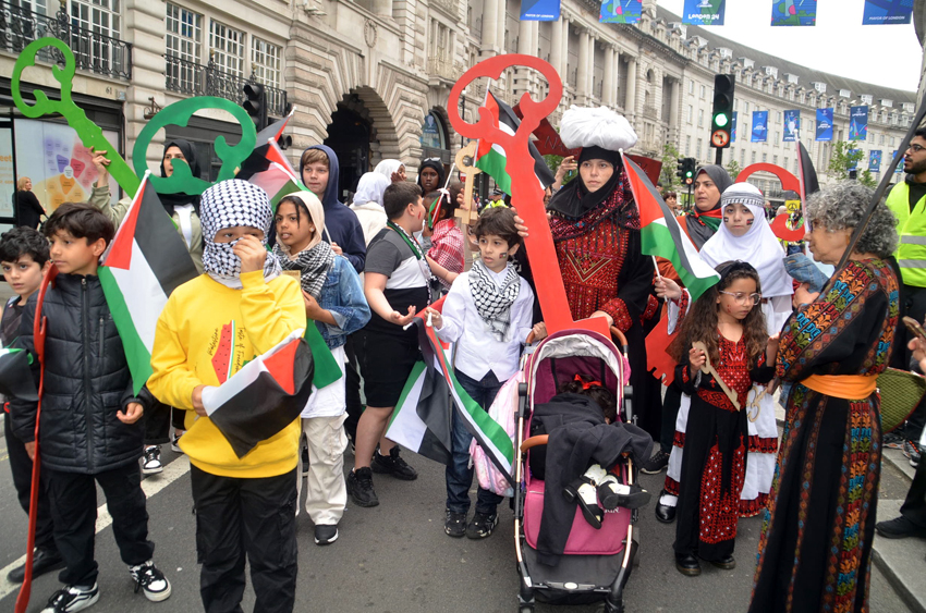 Από την πορεία 250.000 στο Λονδίνο το περασμένο Σάββατο υπέρ της Παλαιστίνης. Προσφυγικές οικογένειες κρατούν συμβολικά κλειδιά στα σπίτια τους που έχουν καταληφτεί από το σιονιστικό κράτος και τους έποικους. (Φωτο The News Line)