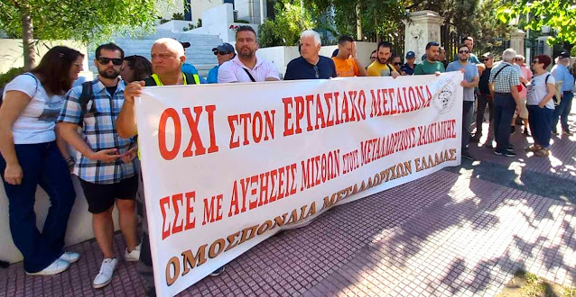 Εκατοντάδες εργαζόμενοι με αντιπροσωπείες από Ομοσπονδία Φαρμάκου, Ομοσπονδία Τύπου-Χάρτου, Συλλόγου Εμποροϋπαλλήλων Αθήνας, Κλαδικού Σωματείου Ενέργειας, Συνδικάτου Μετάλλου Αττικής, κ.α. πραγματοποίησαν συγκέντρωση χτες Τετάρτη απόγευμα στο Υπουργείο Εργασίας για να διαμαρτυρηθούν και να καλέσουν σε αγώνα ενάντια στους νόμους της χούντας Μητσοτάκη που επιβάλλουν, από1 Ιούλη, την κατάργηση του 8ωρου και της πενθήμερης εργασίας στη βιομηχανία, εμπόριο, τράπεζες κ.α.!