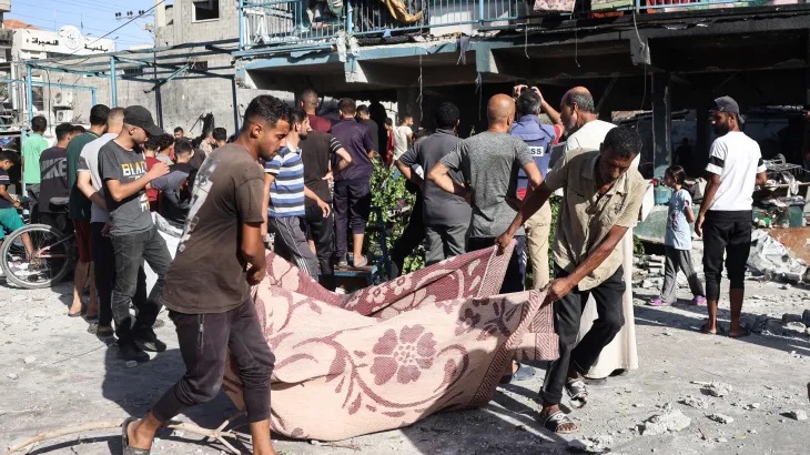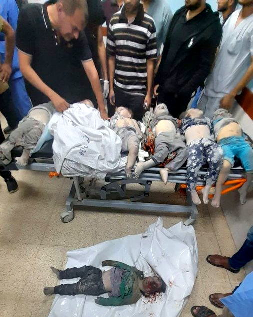 Παλαιστίνιοι μεταφέρουν σορούς ανθρώπων που δολοφονήθηκαν στο χτεσινό (Τετάρτη 11/9) βομβαρδισμό του σχολείου αλ Ζάουνι της UNWRA (Οργανισμός Ενωμένων Εθνών για βοήθεια στους πρόσφυγες) σε προσφυγικό οικισμό στην κεντρική Γάζα. 18 άνθρωποι δολοφονήθηκαν, γυναίκες, παιδιά και 6 εργαζόμενοι της UNWAR. Ήταν η πέμπτη επίθεση των σιονιστών στο σχολείο από τον προηγούμενο Οχτώβρη. (Φωτο Aljazeera).