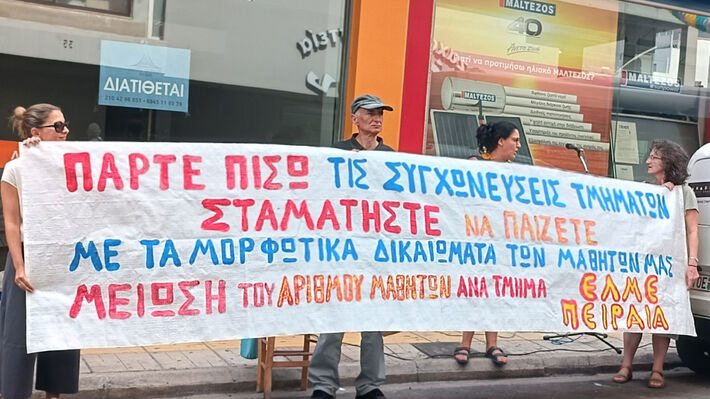 Από την παράσταση διαμαρτυρίας της ΕΛΜΕ Πειραιά την περασμένη Πέμπτη. (Φωτο 902.gr)