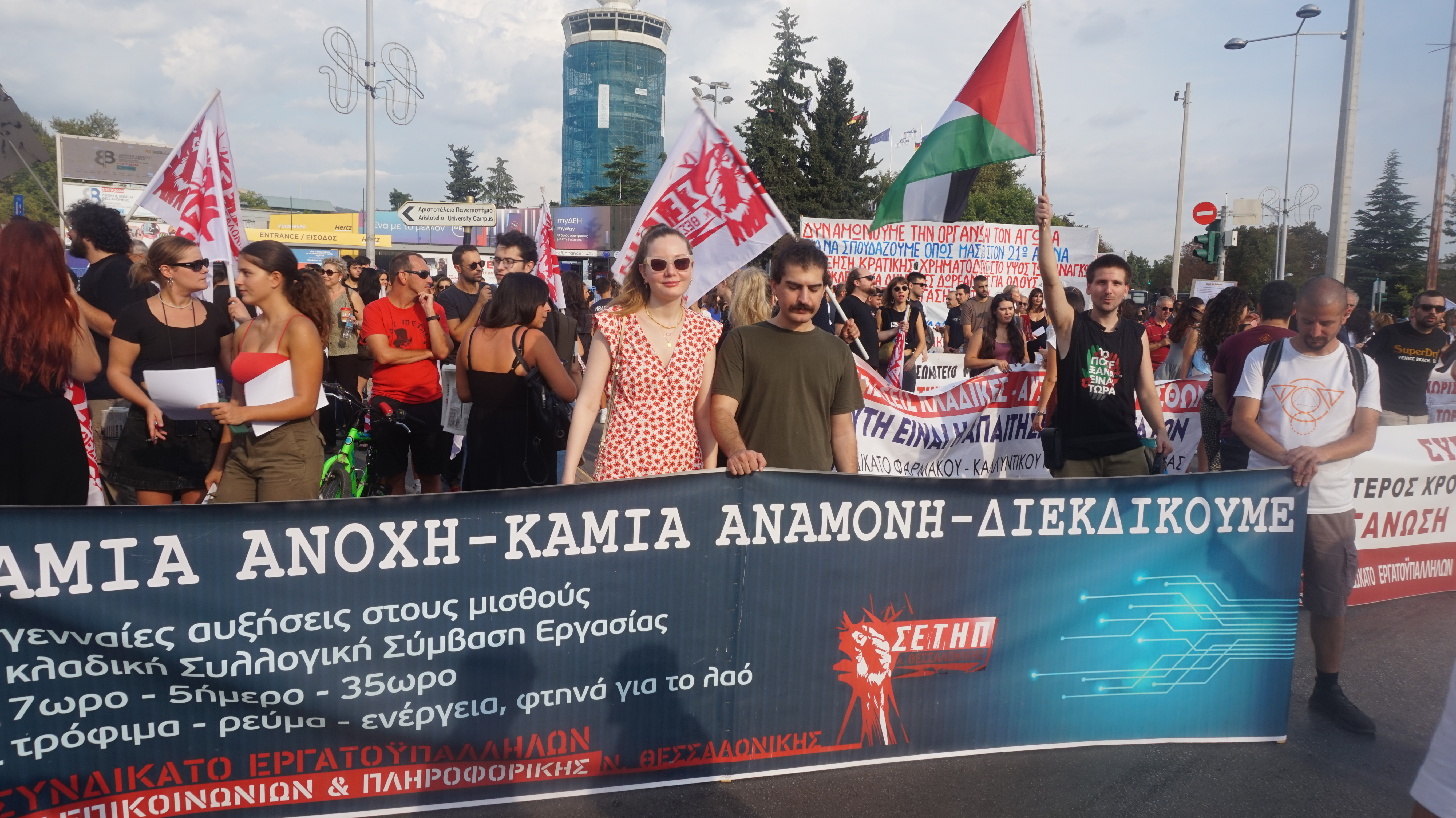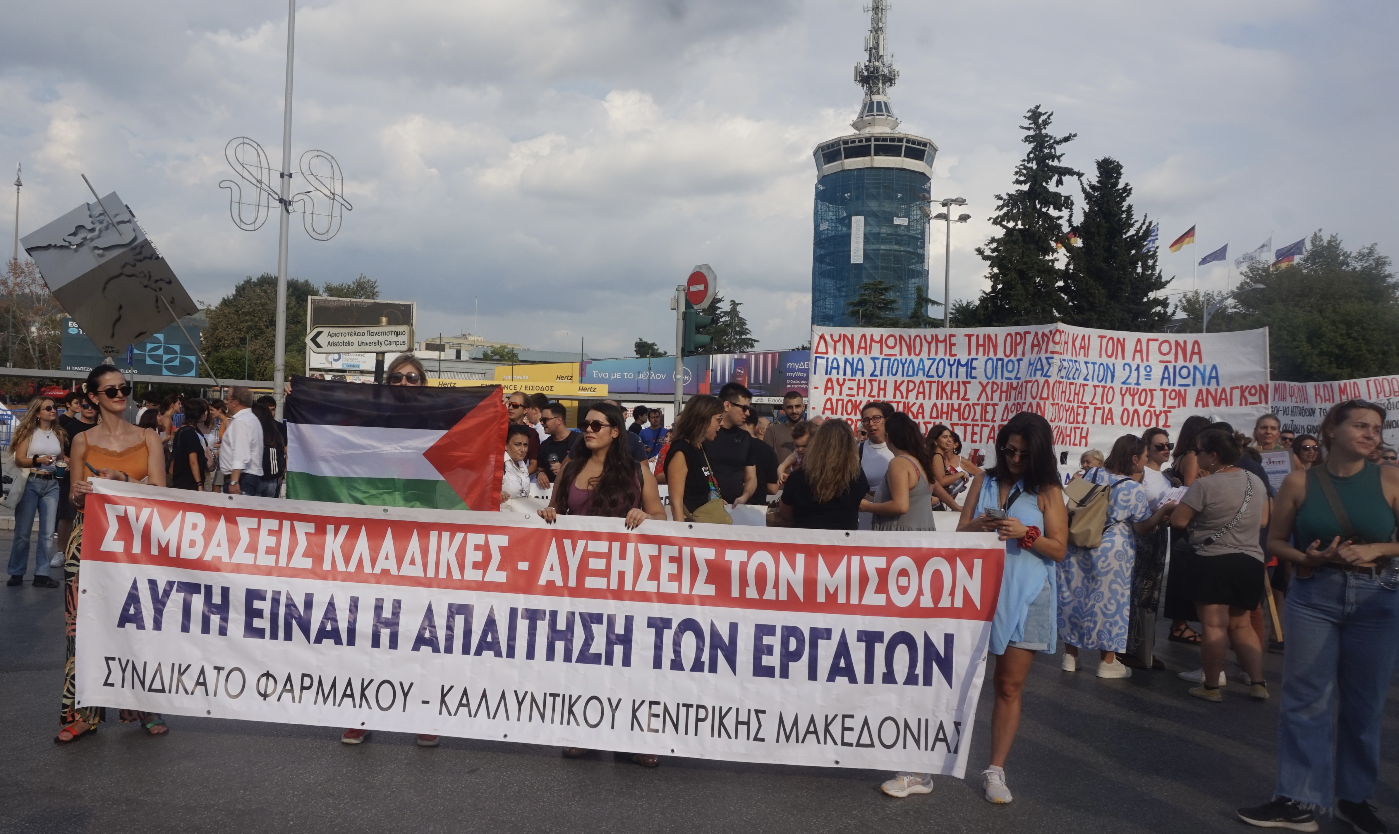 Αντιπροσωπείες από πολλά εργατικά σωματεία συμμετείχαν στη συγκέντρωση – στην πλατεία ΧΑΝΘ – υποστηριχτών του ΠΑΜΕ, με καλοτυπωμένα καλοσχεδιασμένα πανό. Μαζί τους και μεγάλα φοιτητικά πανό. Αρκετές σημαίες της Παλαιστίνης στη συγκέντρωση και πορεία, αλλά καμιά πρόταση για αγώνα ανατροπής της χούντας Μητσοτάκη.