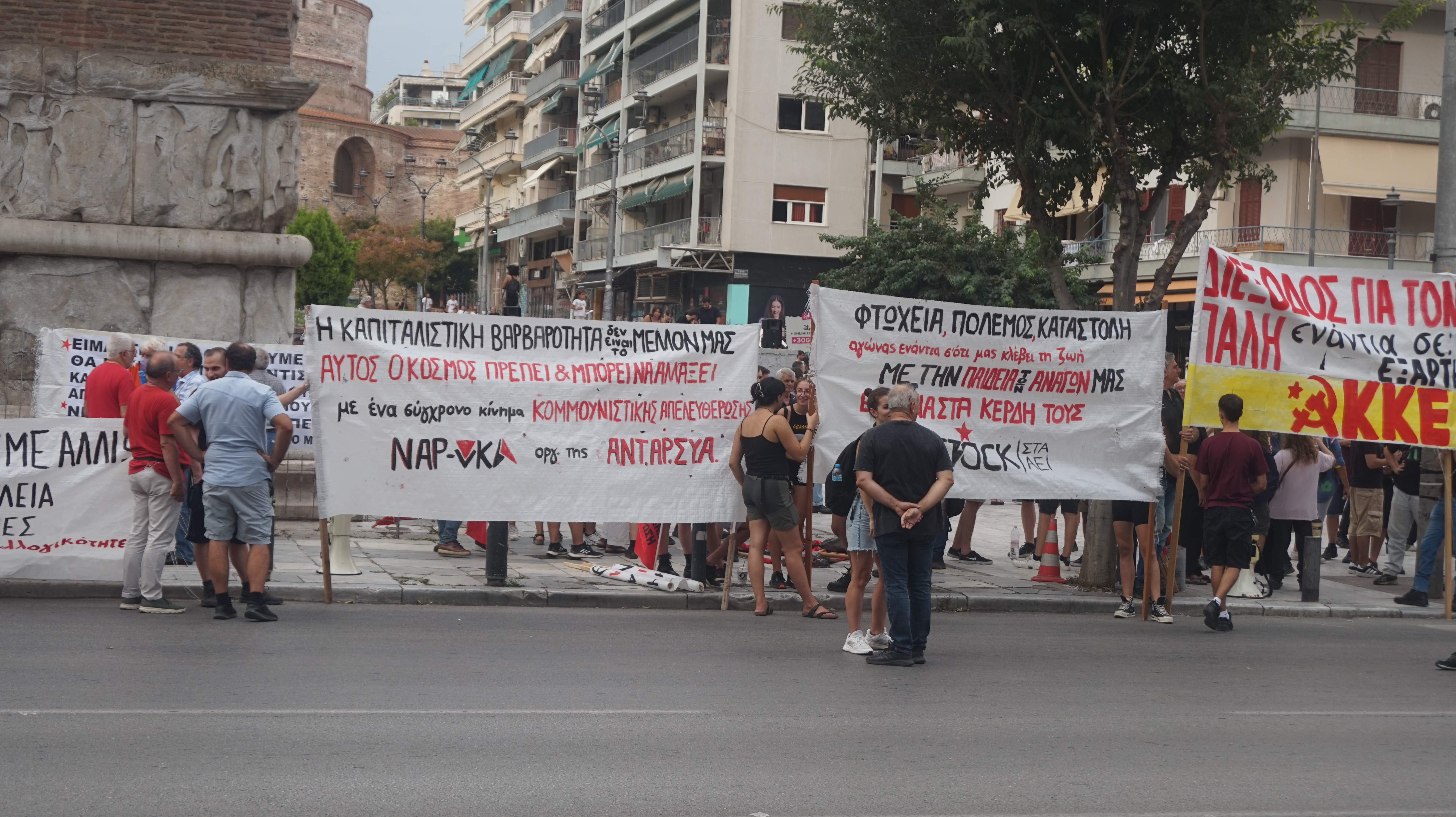 Στην Καμάρα (ρωμαϊκή Αψίδα Γαλέριου) συγκεντρώθηκαν αριστερά κόμματα (ΝΑΡ, ΚΚΕ μ-λ) και συλλογικότητες και εδώ μεγάλη σημαία της Παλαιστίνης. Όμως κι εδώ τα πανό της ΝΑΡ δεν απαιτούσαν αγώνα ανατροπής της κυβέρνησης Μητσοτάκη.