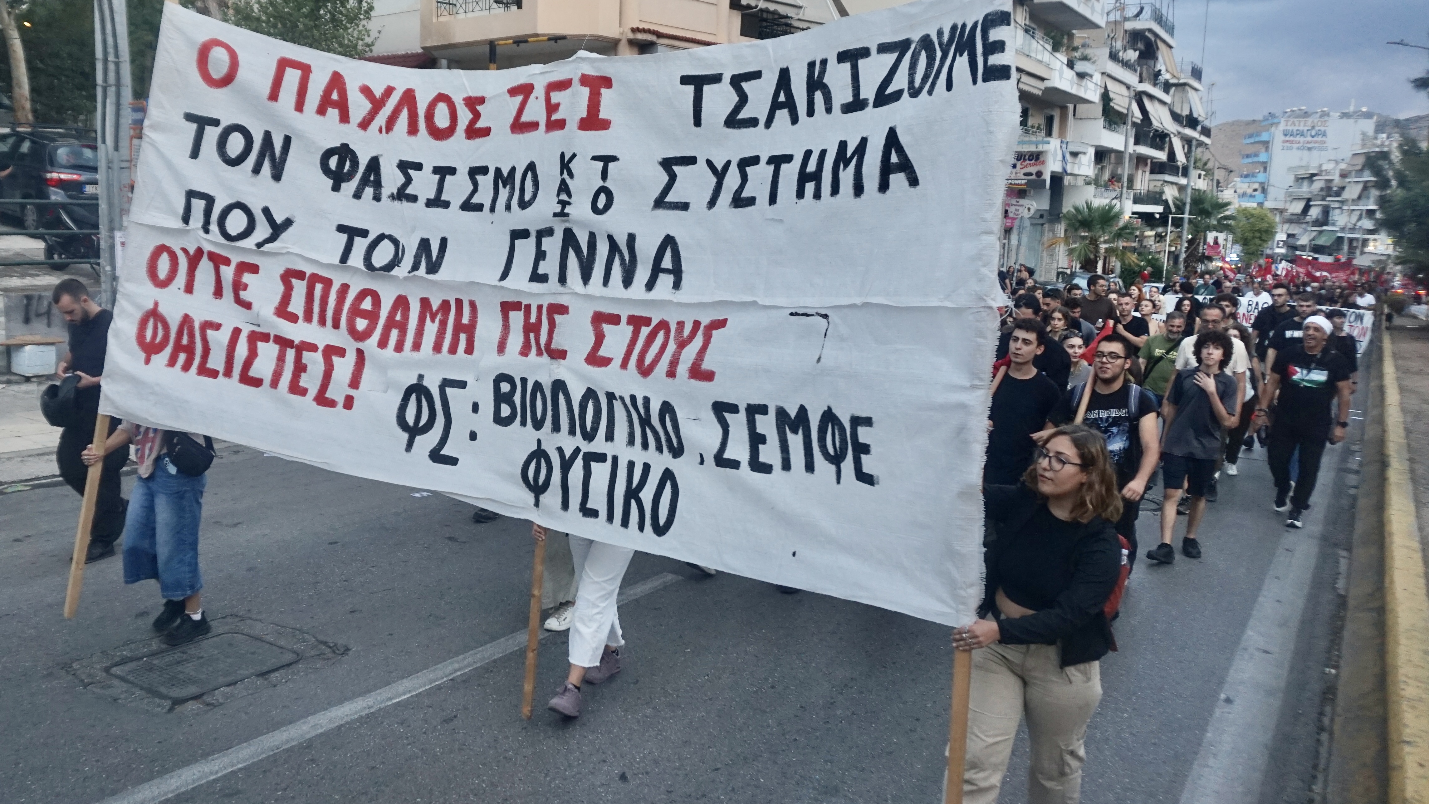 Σ’ όλη την σημερινή πορεία οι ντουντούκες στο πανό των φοιτητικών συλλόγων (Μηχανολόγων, Ναυπηγών, Πολιτικών Μηχανικών, Νομική, Πάντειος) φώναζαν τα συνθήματα: “Θάνατος στον φασισμό και στον ιμπεριαλισμό”, “Ο Παύλος ζει – τσακίστε τους Ναζί”, “Ο λαός δεν ξεχνά – τους φασίστες τους κρεμά”, “Οργή και λύσσα για τον Παύλο Φύσσα”, “Κάτω η Νέα Δημοκρατία”, “Μητσοτάκη κάθαρμα”. –