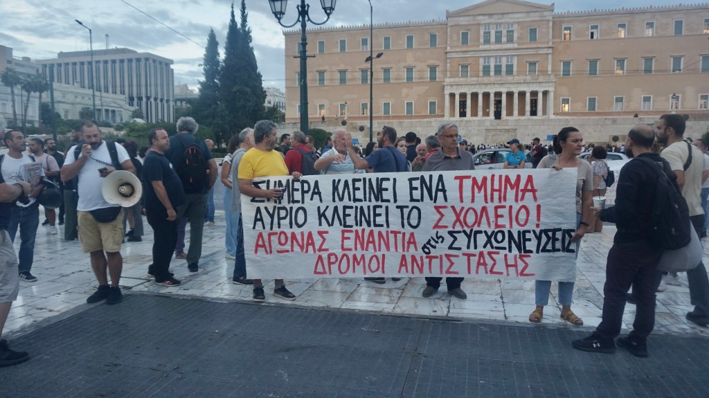 Αντιπροσωπείες από τις ενώσεις πρωτοβάθμιας και δευτεροβάθμιας εκπαίδευσης, ο σύλλογος φοιτητών Βιολογικού και συνδικαλιστικές παρατάξεις εκπαιδευτικών συμμετείχαν το βράδυ της Παρασκευής σε συγκέντρωση απέναντι από τη Βουλή, ενάντια στην πολιτική κατάργησης σχολείων και συγχωνεύσεις τμημάτων της χούντας Μητσοτάκη.