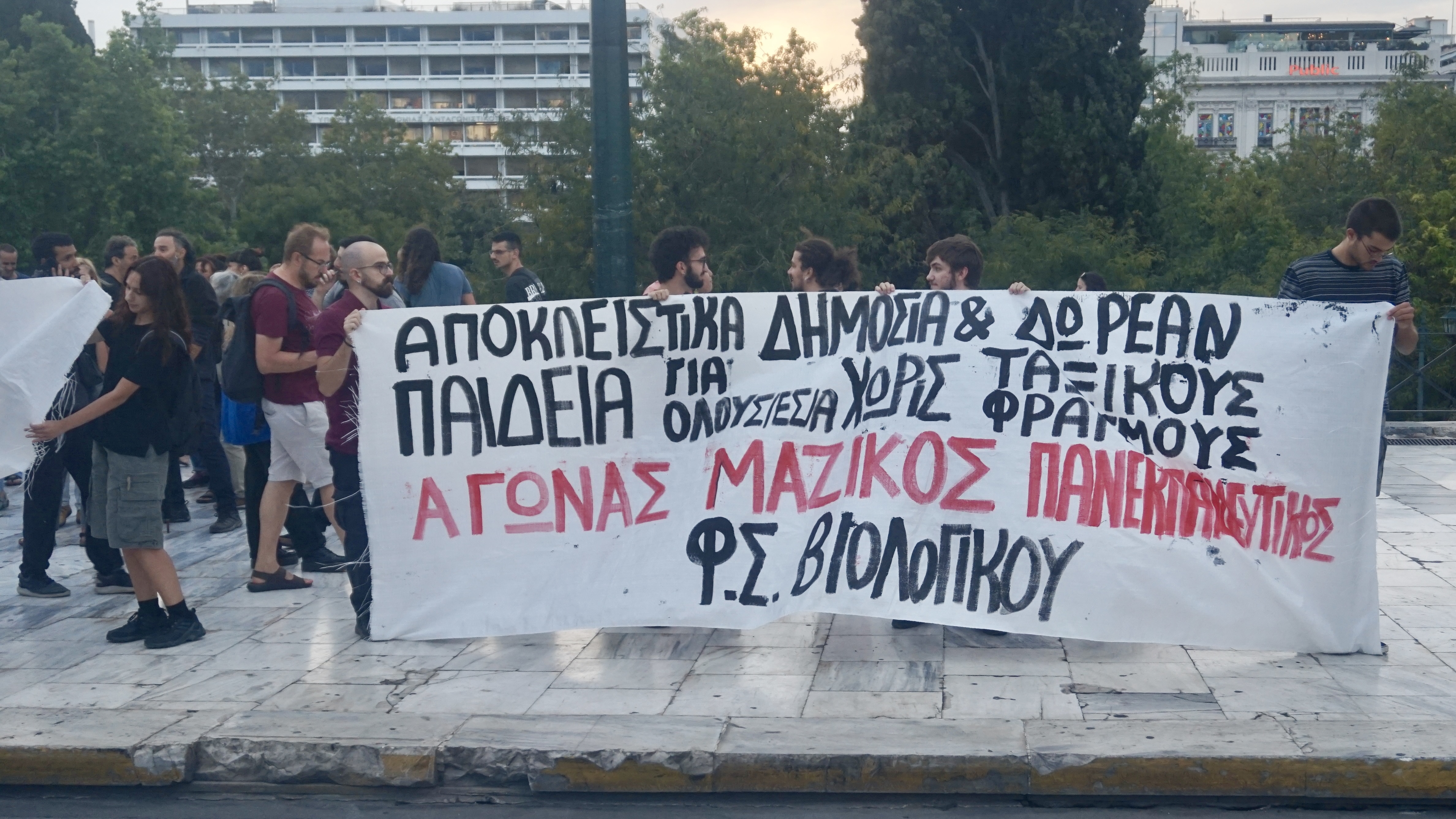 Η αντιπροσωπεία και το πανό του φ.σ. Βιολογικού (Πανεπιστημίου Αθήνας) στη συγκέντρωση της Παρασκευής. (Φωτο Ε.Α.)