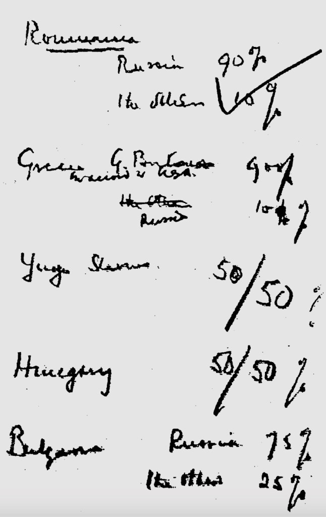Το χαρτί με τις προτάσεις Τσέρτσχιλ και αποδέχτηκε ο Στάλιν. Αναφέρει, “Ελλάδα Μ. Βρετανία σε συνεννόηση με Αμερική 90%, Ρωσία 10%). Στην κατοχή του Αρχείου Τσέρτσχιλ, Βρετανία.