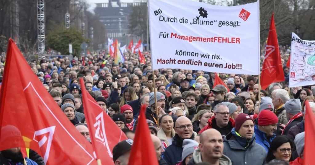Οι συνδικαλιστές ηγέτες του Σωματείου Μετάλλου (IG Metall) στην Φόλκσβαγκεν υπέγραψαν στις 20 Δεκέμβρη συμφωνία 6 χρόνων (2025-30) με την εργοδοσία όπου αναφέρεται ότι δεν θα κλείσει κανένα από τα 10 εργοστάσια της εταιρείας στη Γερμανία και δεν θα υπάρξουν απολύσεις, ενώ οι εργαζόμενοι/ες θα υποστούν μεγάλες μειώσεις μισθού και θα εργάζονται 1-2 ώρες περισσότερο!