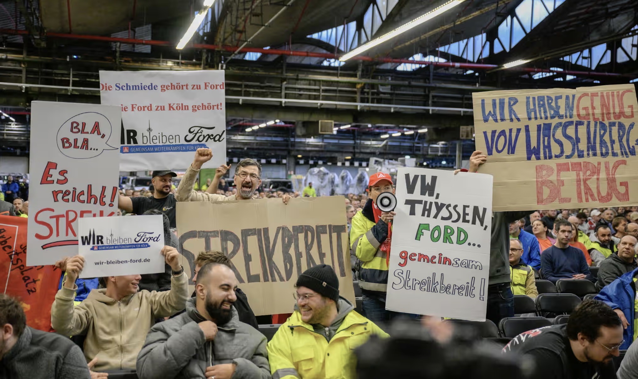 Κινητοποίηση εργατών στο εργοστάσιο της Φορντ στην Κολονία, Γερμανία, 10/12/24, ενάντια στην επίσκεψη του καγκελάριου Σολτζ. (φωτο Sasha Schuermann)