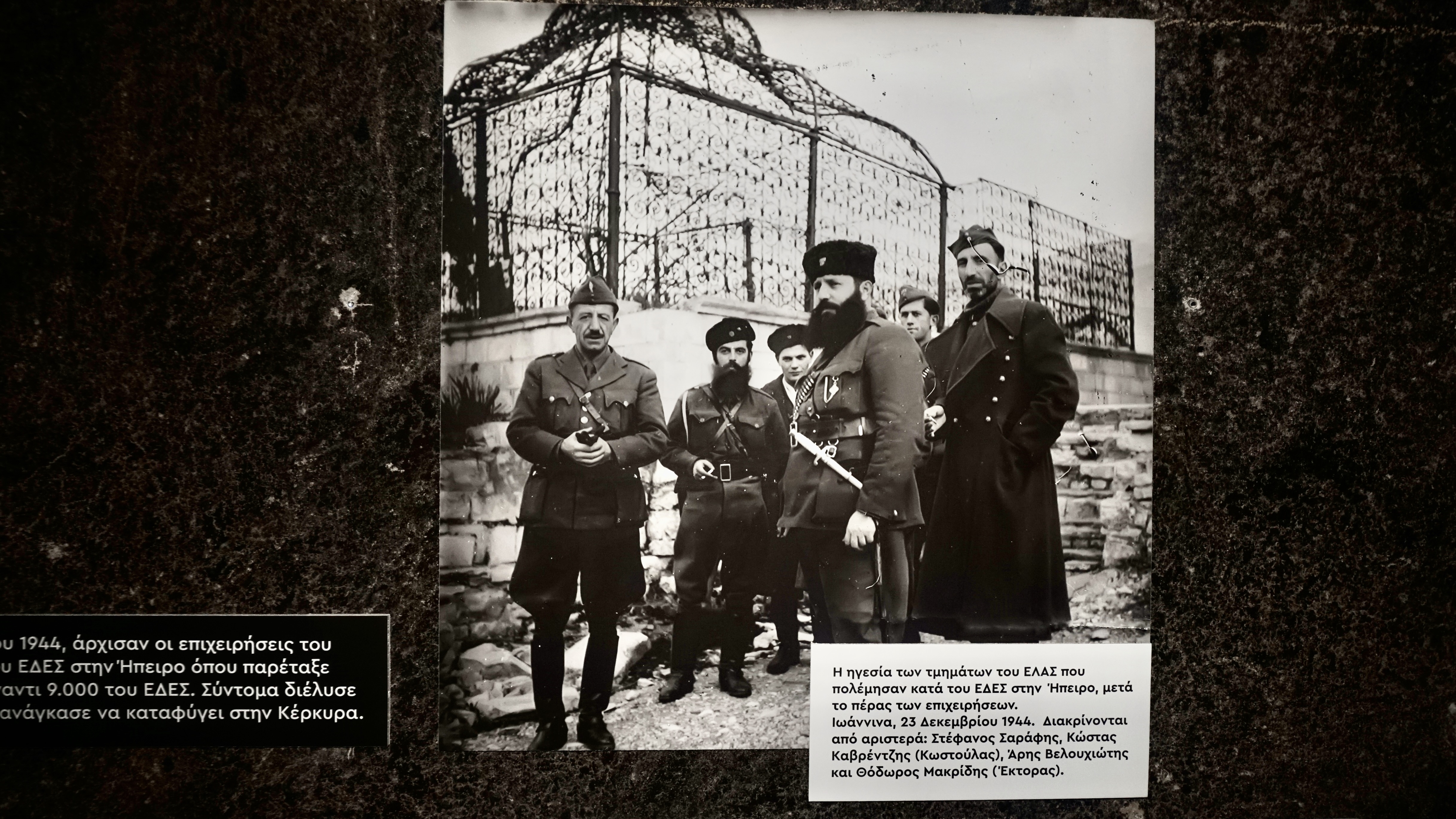 Φωτογραφία Άρη, Σαράφη και ηγετών ΕΛΑΣ στα Γιάννενα 23 Δεκέμβρη 1944, όταν στην Αθήνα τα βρετανικά τανκς και αεροπλάνα δολοφονούσαν τους μαχητές του ΕΑΜ και το λαό Αθήνας – Πειραιά. Από την έκθεση αρχείων που διοργάνωσε το ΚΚΕ με τίτλο «Το απελευθερωτικό – επαναστατικό 1944», στα πρώην δικαστήρια Σταδίου – Σανταρόζα, Αθήνα.