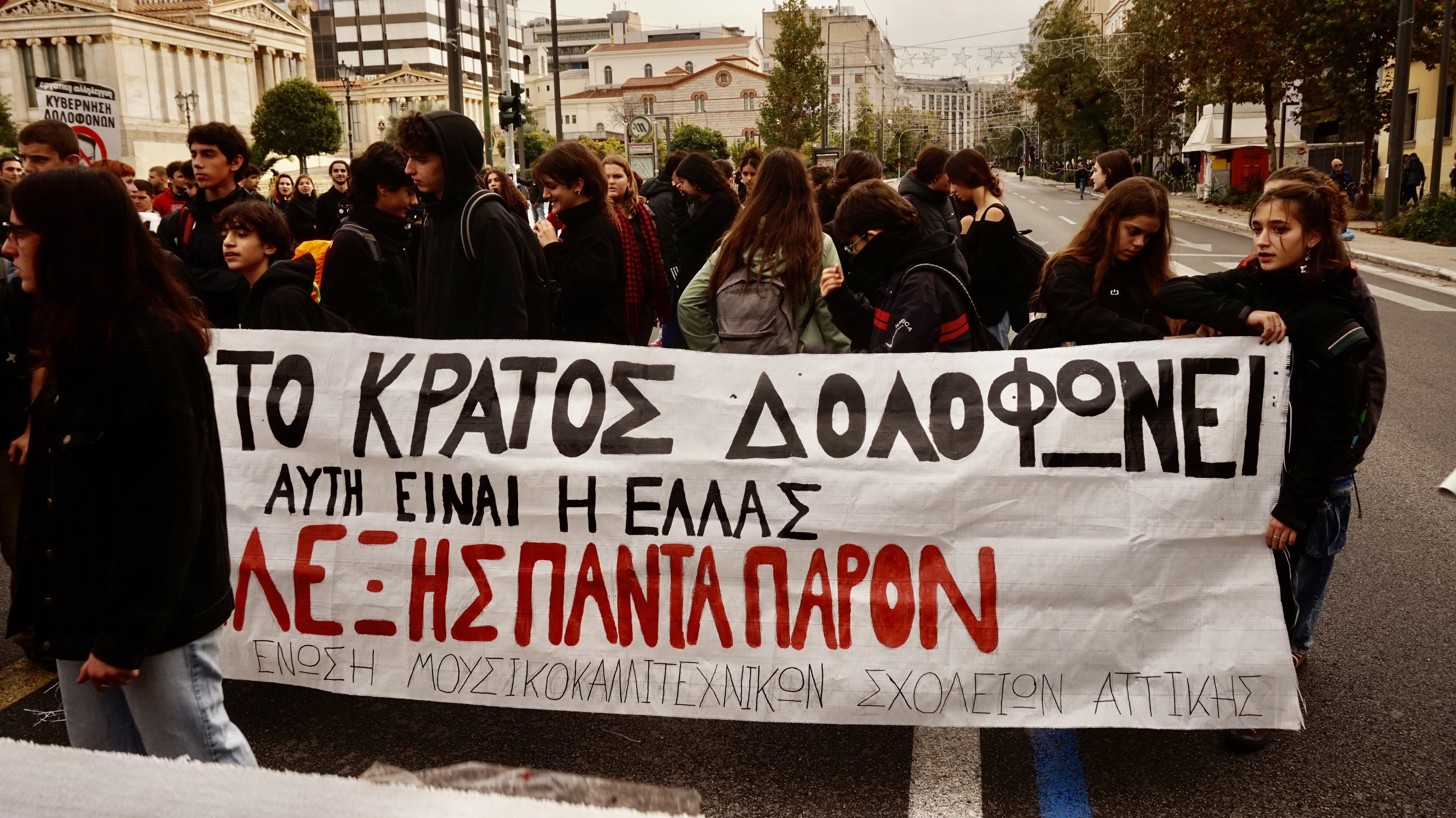 Το πανό των Μουσικοκαλλιτεχνικών σχολείων Αττικής στη χτεσινή μεσημεριάτικη πορεία. (φωτο Ε.Α.)